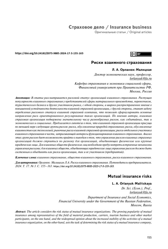 Логвинова И.Л. Взаимные страховые организации как субъекты предпринимательской деятельности. Экономические науки. 2010. № 5. С. 182-189.