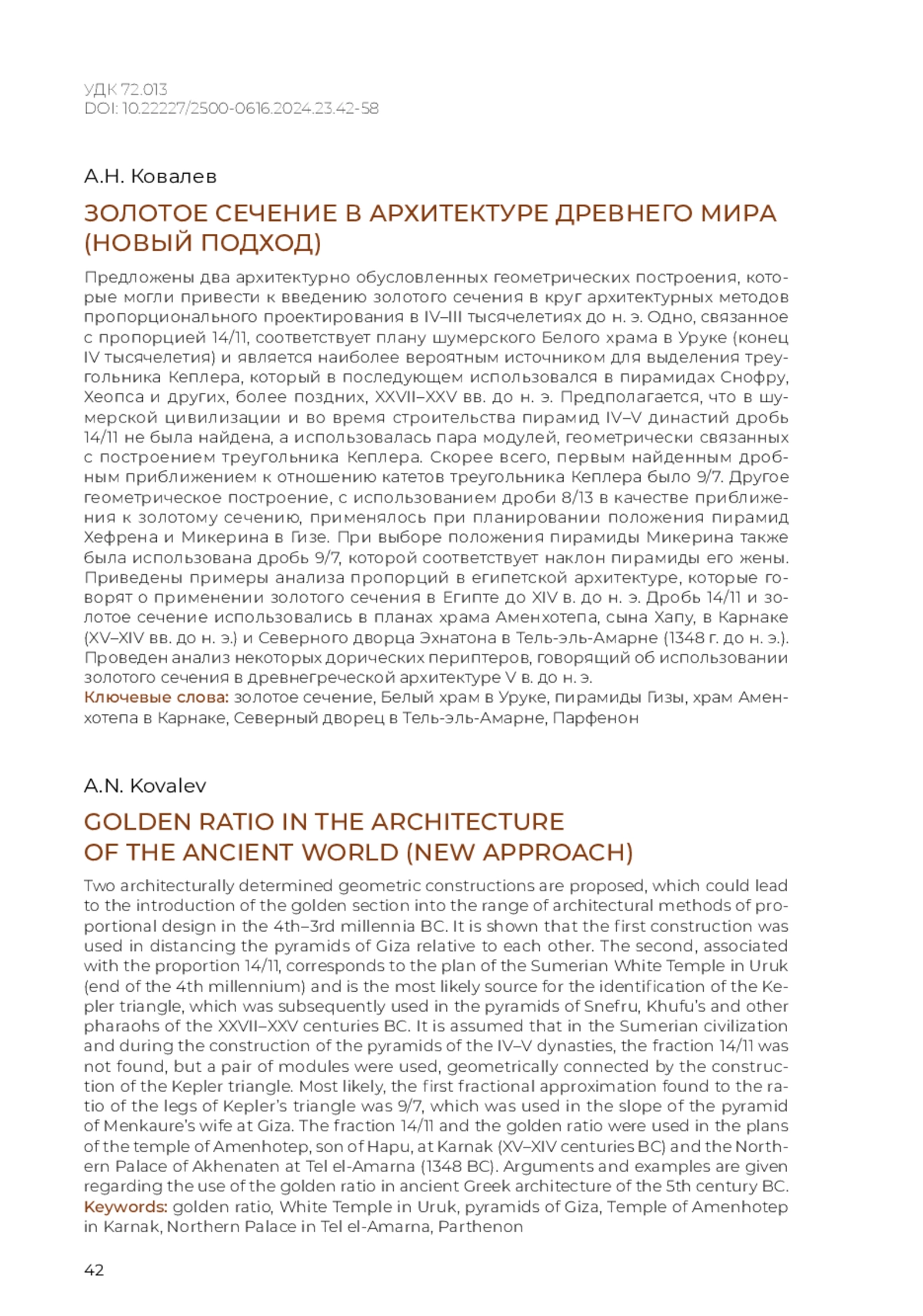 Предложены два архитектурно обусловленных геометрических построения, которые могли привести к введению золотого сечения в круг архитектурных методов пропорционального проектирования в IV–III тысячелетиях до н. э. Одно, связанное с пропорцией 14/11, соответствует плану шумерского Белого храма в Уруке (конец IV тысячелетия) и является наиболее вероятным источником для выделения треугольника Кеплера, который в последующем использовался в пирамидах Снофру, Хеопса и других, более поздних, XXVII–XXV вв. до н. э. Предполагается, что в шумерской цивилизации и во время строительства пирамид IV–V династий дробь 14/11 не была найдена, а использовалась пара модулей, геометрически связанных с построением треугольника Кеплера. Скорее всего, первым найденным дробным приближением к отношению катетов треугольника Кеплера было 9/7. Другое геометрическое построение, с использованием дроби 8/13 в качестве приближения к золотому сечению, применялось при планировании положения пирамид Хефрена и Микерина в Гизе. При выборе положения пирамиды Микерина также была использована дробь 9/7, которой соответствует наклон пирамиды его жены. Приведены примеры анализа пропорций в египетской архитектуре, которые говорят о применении золотого сечения в Египте до XIV в. до н. э. Дробь 14/11 и золотое сечение использовались в планах храма Аменхотепа, сына Хапу, в Карнаке (XV–XIV вв. до н. э.) и Северного дворца Эхнатона в Тель-эль-Амарне (1348 г. до н. э.). Проведен анализ некоторых дорических периптеров, говорящий об использовании золотого сечения в древнегреческой архитектуре V в. до н. э.
