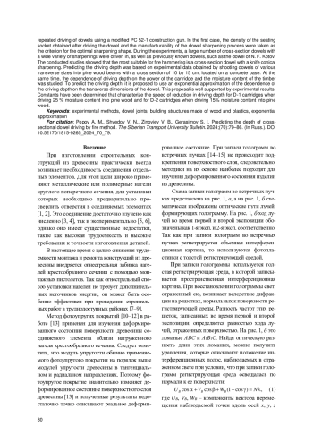 Целью данной работы является выбор оптимальной формы заточки нагелей, предназначенных для огнестрельной забивки, и разработка методики оценки и прогнозирования глубины забивки нагеля крестообразного поперечного сечения при помощи монтажного пистолета. Обе задачи решались на основе экспериментальных данных, полученных при многократном забивании нагелей с помощью модифицированного строительного пистолета ПЦ 52-1. В первом случае за критерий оптимальной формы заточки принимались плотность посадочного гнезда, получаемого после забивки нагеля, и технологичность процесса его заточки. При проведении экспериментов было забито большое количество нагелей крестообразного сечения с самой различной заточкой, а также ранее известных нагелей, таких как нагель Н. Ф. Котова. Проведенные исследования показали, что наиболее подходящим для огнестрельной забивки является нагель крестообразного сечения с ножевой конической заточкой. Прогнозирование глубины забивки опиралось на экспериментальные данные, полученные при огнестрельном забивании нагелей различных поперечных размеров в брус из древесины сосны поперечным сечением 10 на 15 см, расположенный на бетонном основании. При этом изучалась зависимость глубины забивки от мощности патрона и влажности древесины бруса. Для прогнозирования глубины забивки предложено использовать экспоненциальную аппроксимацию зависимости глубины забивки от поперечных размеров нагеля. Данное предложение хорошо подтверждается экспериментальными результатами. Определены константы, характеризующие быстроту уменьшения глубины забивки для патронов Д-1 при забивании в древесину сосны влажности 25 % и для патронов Д-2 при забивании в древесину сосны влажности 15 %.