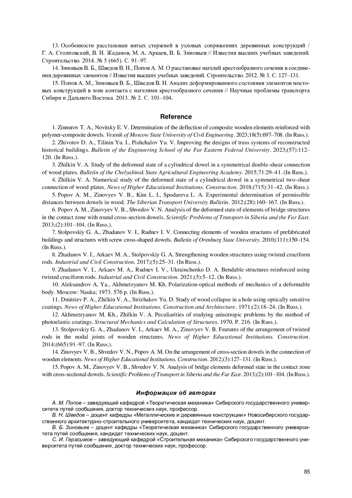15. 	Попов А. М., Зиновьев В. Б., Шведов В. Н. Анализ деформированного состояния элементов мостовых конструкций в зоне контакта с нагелями крестообразного сечения // Научные проблемы транспорта Сибири и Дальнего Востока. 2013. № 2. С. 101-104. EDN: RSMOWB