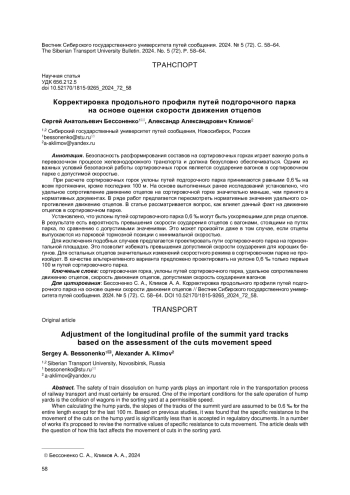 3. Бессоненко С. А., Гунбин А. А., Климов А. А. Актуализация параметров “расчетных бегунов”, используемых при проектировании сортировочных горок // Вестник ВНИИЖТ. 2024. № 1. С. 60-68. EDN: WURYLQ