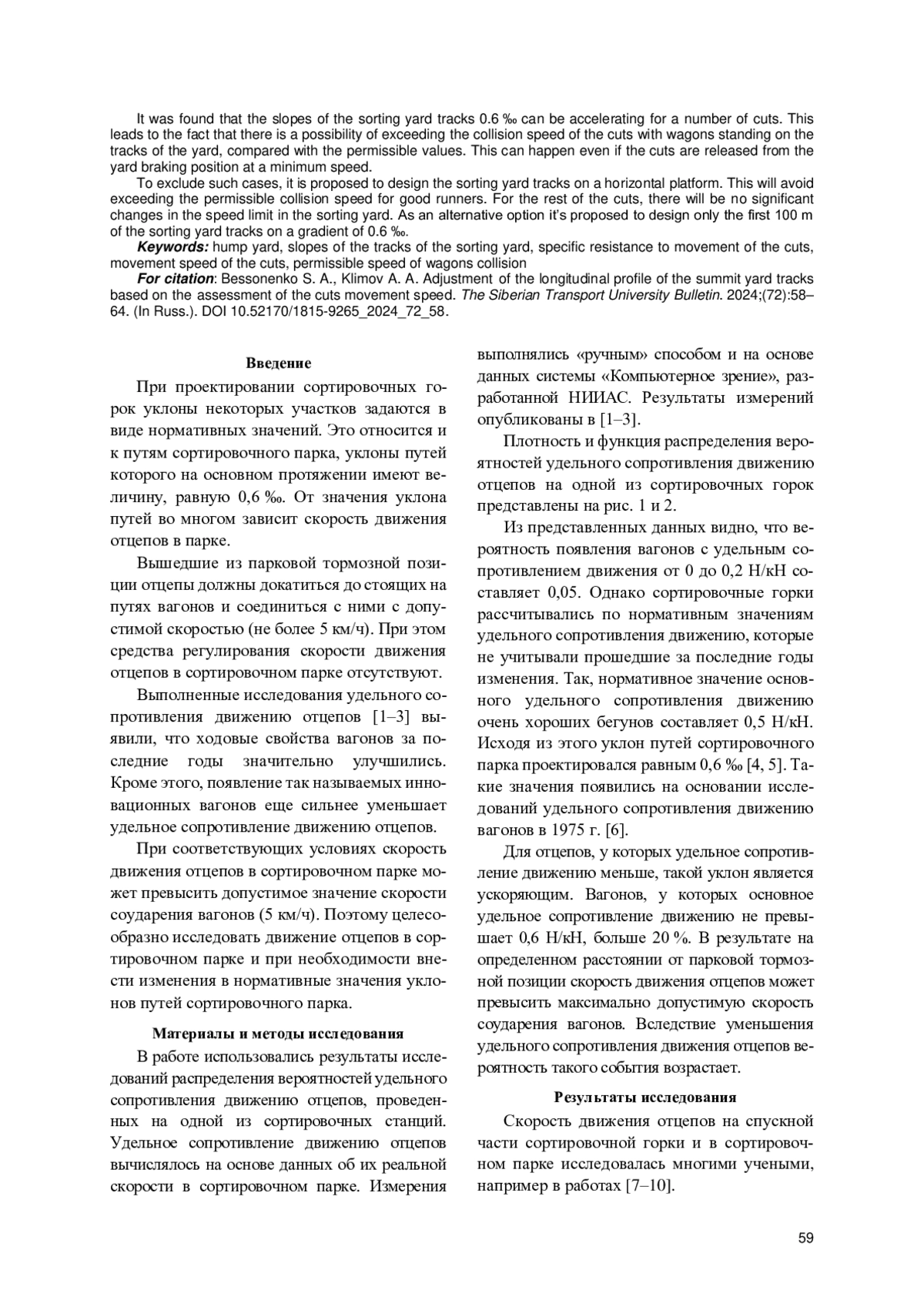 3. 	Бессоненко С. А., Гунбин А. А., Климов А. А. Актуализация параметров “расчетных бегунов”, используемых при проектировании сортировочных горок // Вестник ВНИИЖТ. 2024. № 1. С. 60-68. EDN: WURYLQ
