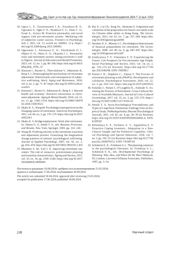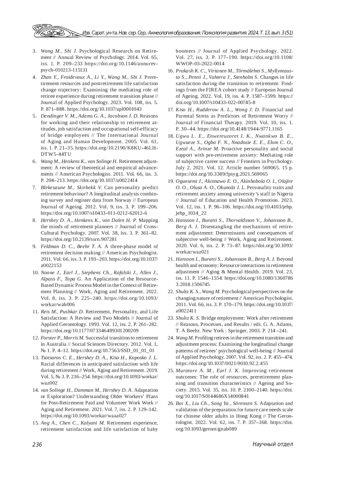 15. Ang A., Chen C., Kalyani M. Retirement experience, retirement satisfaction and life satisfaction of baby boomers // Journal of Applied Psychology. 2022. Vol. 27, iss. 3. P. 177-190. 10.1108/ WWOP-03-2022-0014. DOI: 10.1108/WWOP-03-2022-0014