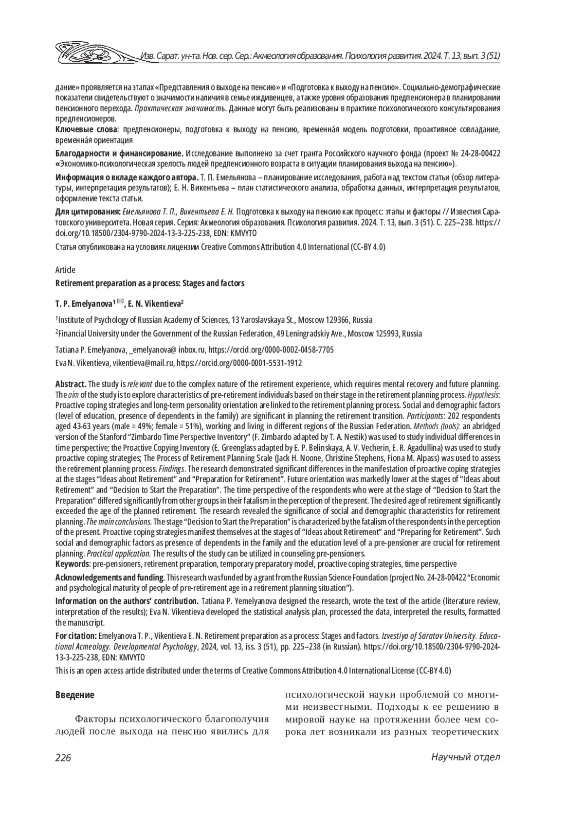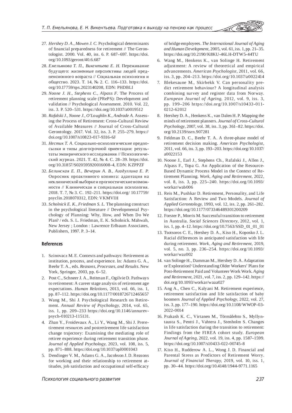 28. Емельянова Т. П., Викентьева Е. Н. Переживание будущего: жизненные перспективы людей предпенсионного возраста // Социальная психология и общество. 2023. Т. 14, № 2. C. 116-133. ,. DOI: 10.17759/sps.2023140208 EDN: PHDBLI