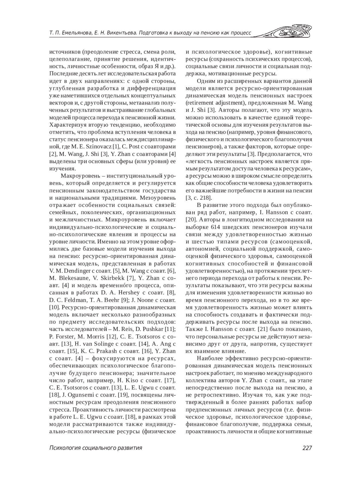 6. Wang M., Henkens K., van Solinge H. Retirement adjustment: A review of theoretical and empirical advancements // American Psychologist. 2011. Vol. 66, iss. 3. Р. 204-213. DOI: 10.1037/a0022414