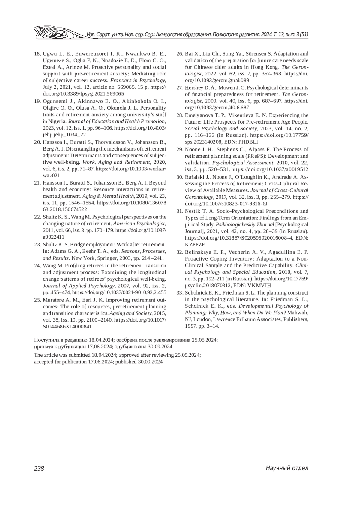 19. Ogunsemi J., Akinnawo E. O., Akinbobola O. I., Olajire O. O., Olusa A. O., Okunola J. L. Personality traits and retirement anxiety among university’s staff in Niger ia // Journal of Education and Health Promotion. 2023. Vol. 12, iss. 1. Р. 96-106. DOI: 10.4103/jehp.jehp_1034_22 EDN: KWRZMI