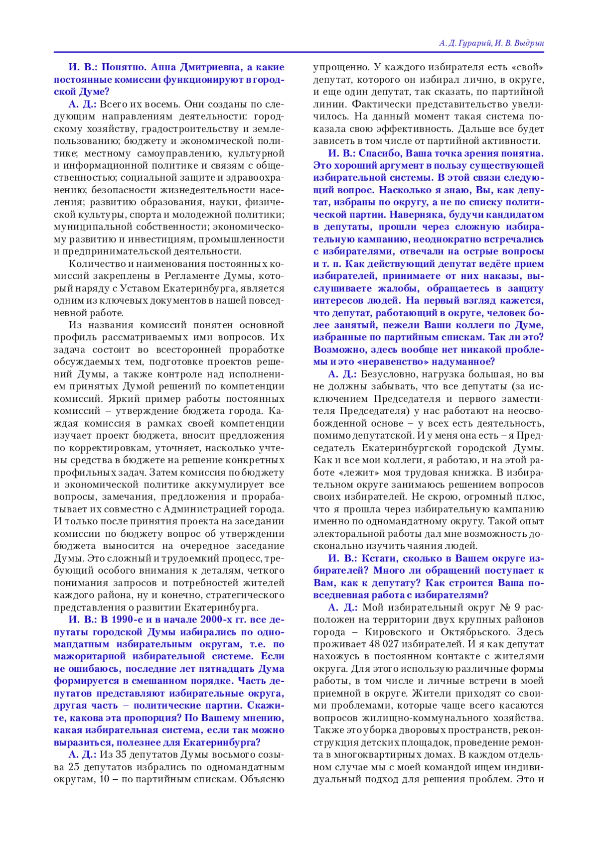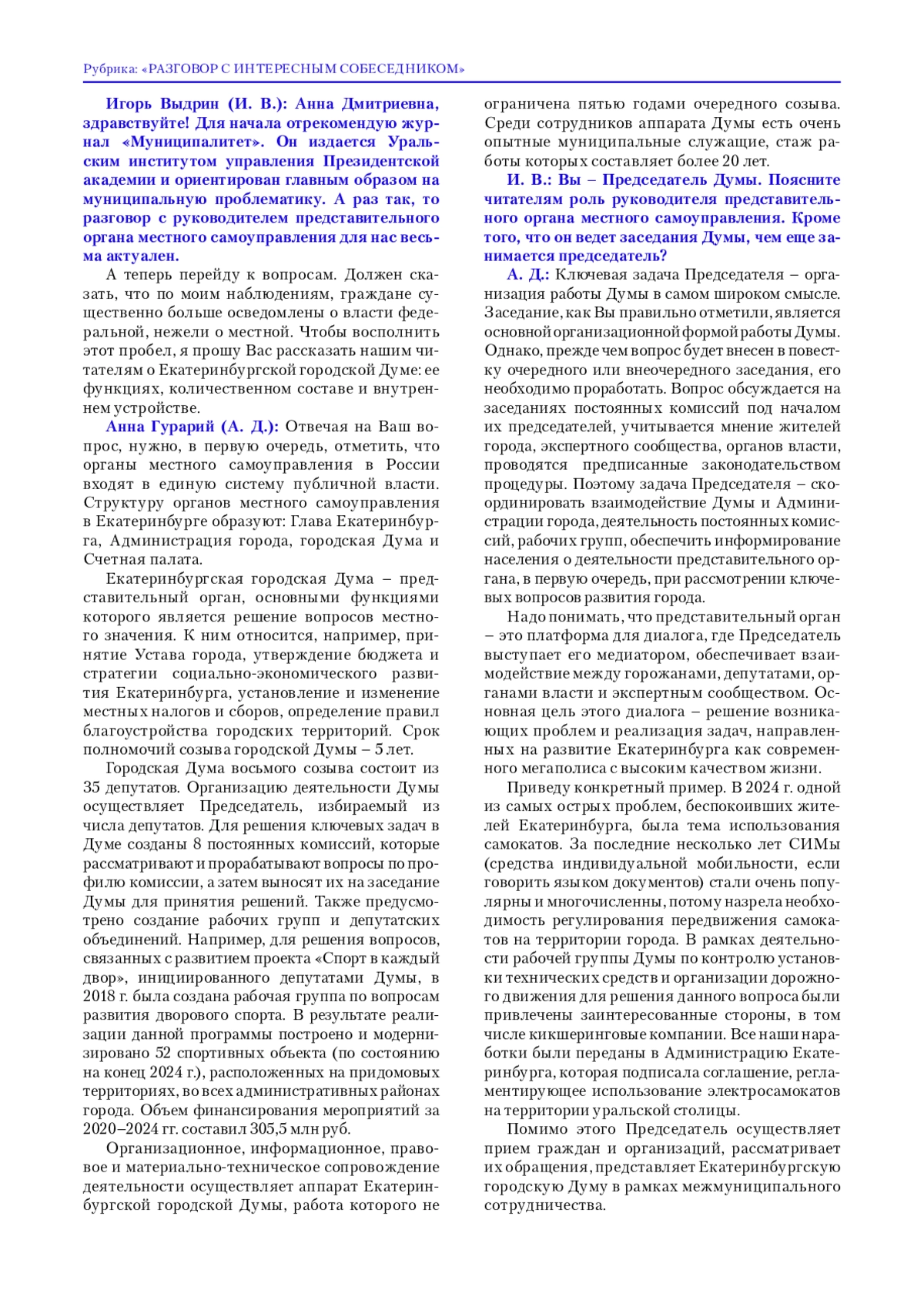 Редакция журнала «Муниципалитет: экономика и управление» представляет Председателя Екатеринбургской городской Думы – Анну Дмитриевну Гурарий. С гостьей нашей рубрики «Разговор с интересным собеседником» встречается главный редактор журнала, доктор юридических наук, профессор Игорь Вячеславович Выдрин.