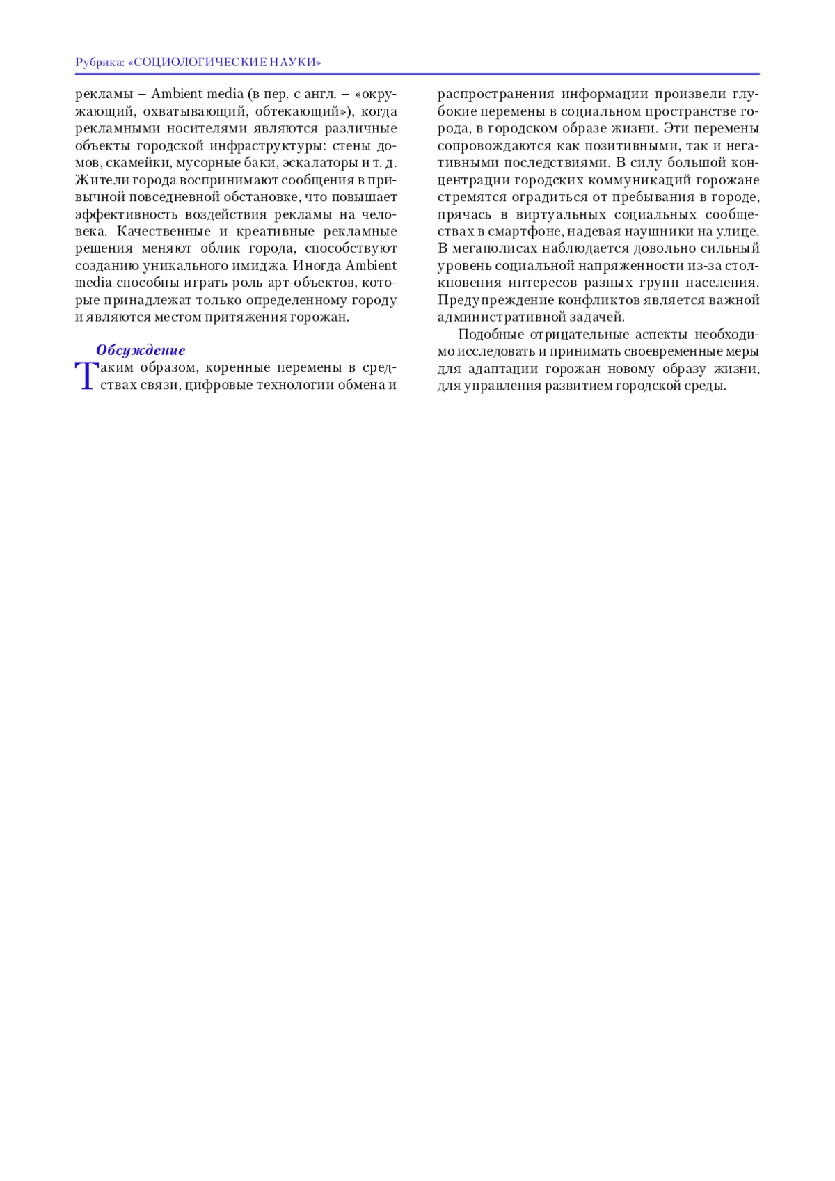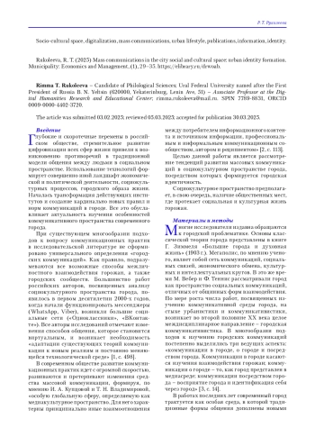 Материалы и методы. Методологической основой исследования является социокультурный подход, позволяющий рассматривать пространство города как единство социальных общностей, культурных ценностей и коммуникаций. Использованы методы социологических исследований - системный анализ, структурно-функциональный анализ, наблюдение, сравнение. Проанализировано содержание массовой информации как средства коммуникации. Обобщены коммуникативные практики, опыт деятельности различных субъектов, использованы материалы личных наблюдений. Результаты и выводы. Изменение способов массовой коммуникации оказывает значительное влияние на формирование городской идентичности - ключевого элемента осознания горожанами своей принадлежности к социально-культурному пространству. В современных условиях центральную роль в этом процессе играют цифровые платформы: городские сайты и паблики становятся виртуальными площадками для диалога, обмена идеями и коллективного конструирования образа города. Активность горожан трансформируется в реальные действия по созданию комфортной среды, что подчеркивает взаимосвязь виртуального и физического пространств. Особый интерес представляет Ambient media - инновационный формат рекламы, использующий нестандартные носители: арт-объекты, интерактивные инсталляции, проекции. Обсуждение. Большую популярность имеют паблики - публичные страницы города в социальных сетях, где каждый участник имеет право высказать свое мнение, активно включиться в обсуждение проблем. Сегодня, по мнению исследователей, паблики становятся крупными публичными комьюнити, способными влиять на социальные процессы. Городские сообщества через коммуникацию о городе создают его особое социокультурное пространство на разных уровнях. Это и межличностные коммуникации горожан, и каналы коммуникации, и культурно-досуговая сфера. Важной темой для обсуждения становится имидж города, привлекательность которого важна для местных жителей и туристов. Массовая коммуникация может как поддерживать, так и трансформировать городскую идентичность, способствуя созданию уникального образа города.