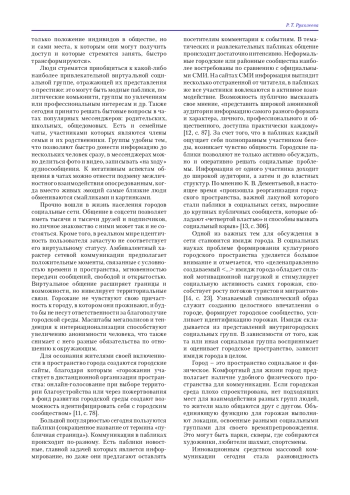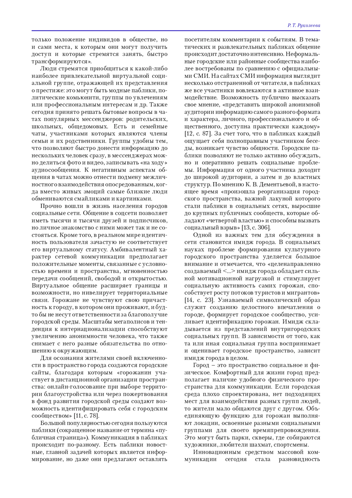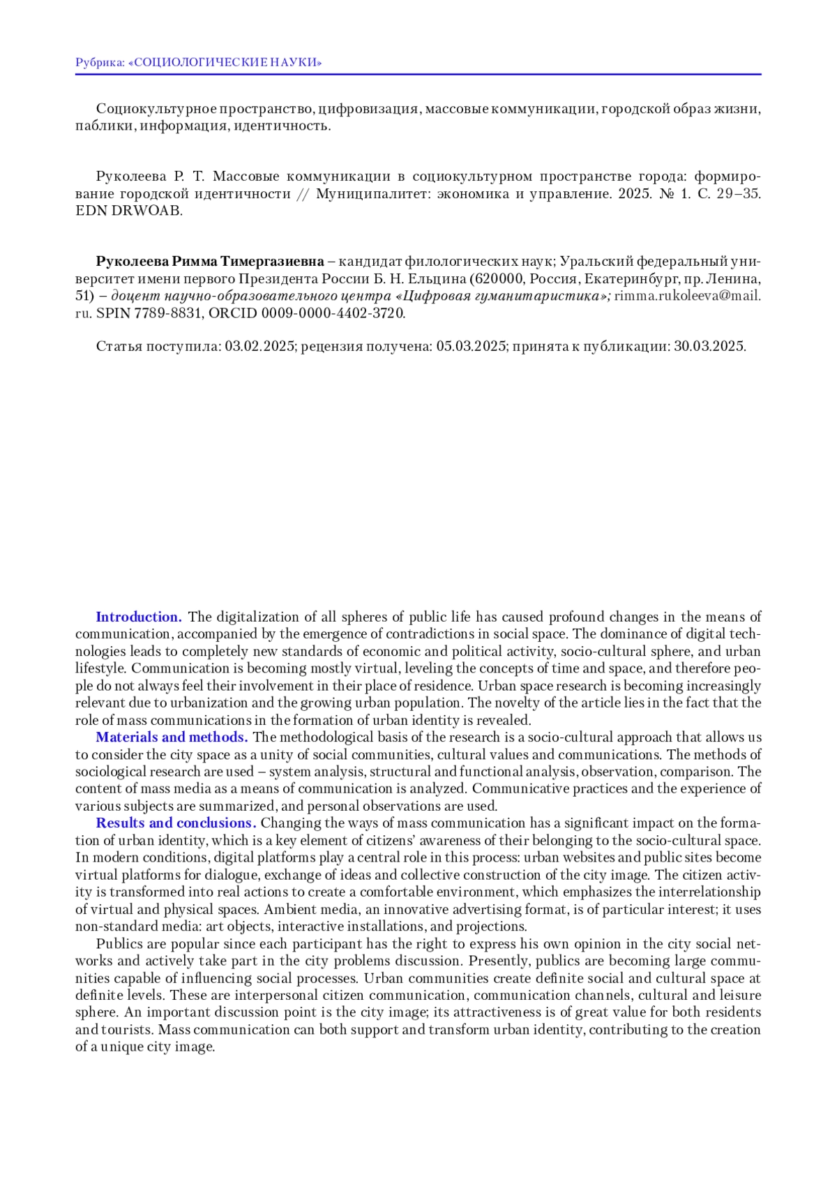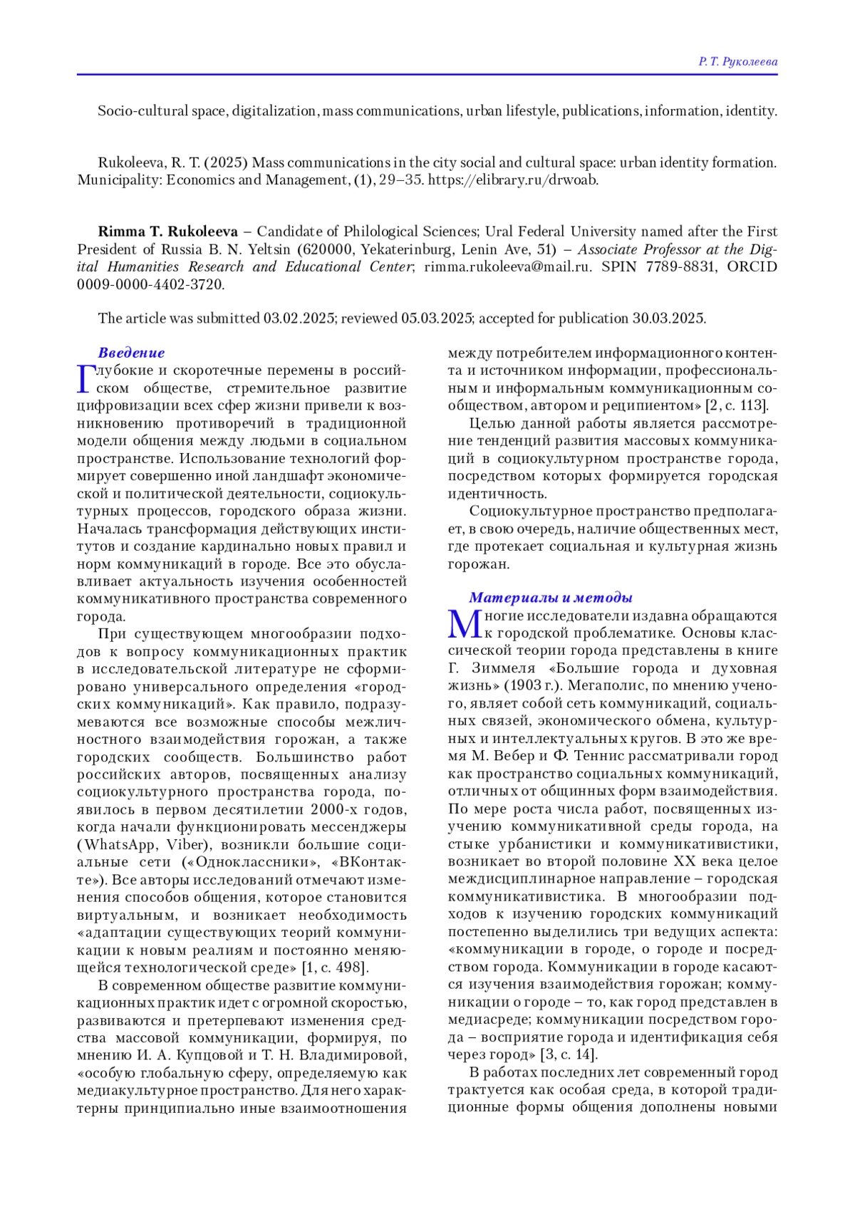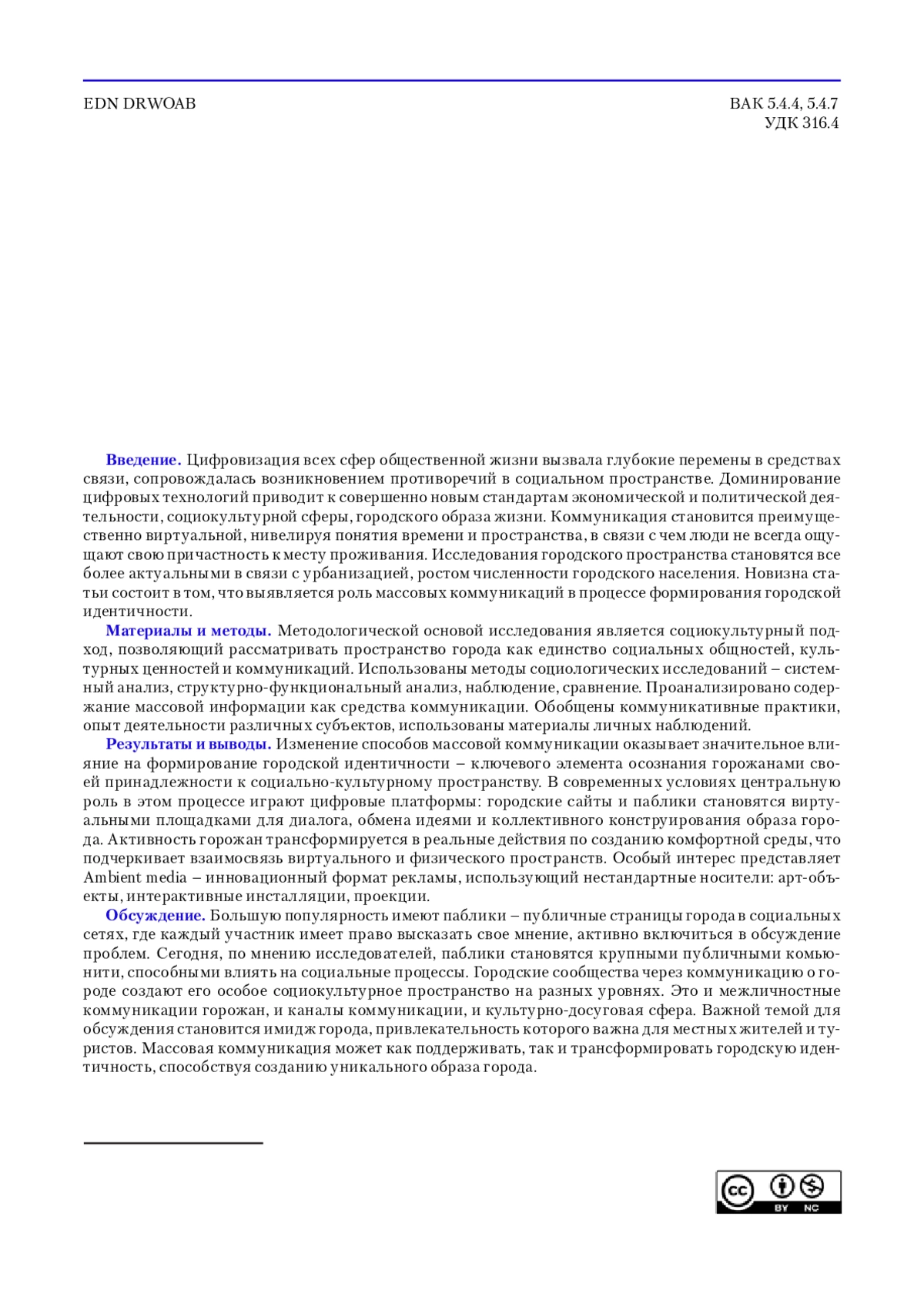 Введение. Цифровизация всех сфер общественной жизни вызвала глубокие перемены в средствах связи, сопровождалась возникновением противоречий в социальном пространстве. Доминирование цифровых технологий приводит к совершенно новым стандартам экономической и политической деятельности, социокультурной сферы, городского образа жизни. Коммуникация становится преимущественно виртуальной, нивелируя понятия времени и пространства, в связи с чем люди не всегда ощущают свою причастность к месту проживания. Исследования городского пространства становятся все более актуальными в связи с урбанизацией, ростом численности городского населения. Новизна статьи состоит в том, что выявляется роль массовых коммуникаций в процессе формирования городской идентичности.
