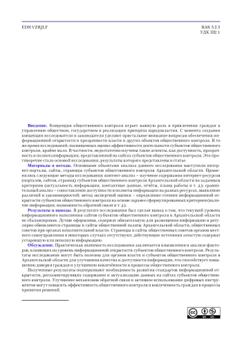 Введение. Концепция общественного контроля играет важную роль в привлечении граждан к управлению обществом, государством и реализации принципа народовластия. С момента создания концепции исследователи и законодатели уделяют пристальное внимание вопросам обеспечения информационной открытости и прозрачности власти и других объектов общественного контроля. В то же время исследований, посвященных оценке эффективности деятельности субъектов общественного контроля, крайне мало. В частности, недостаточно изучены такие аспекты, как доступность, прозрачность и полнота информации, представленной на сайтах субъектов общественного контроля. Это противоречие стало основой исследования, результаты которого представлены в статье.