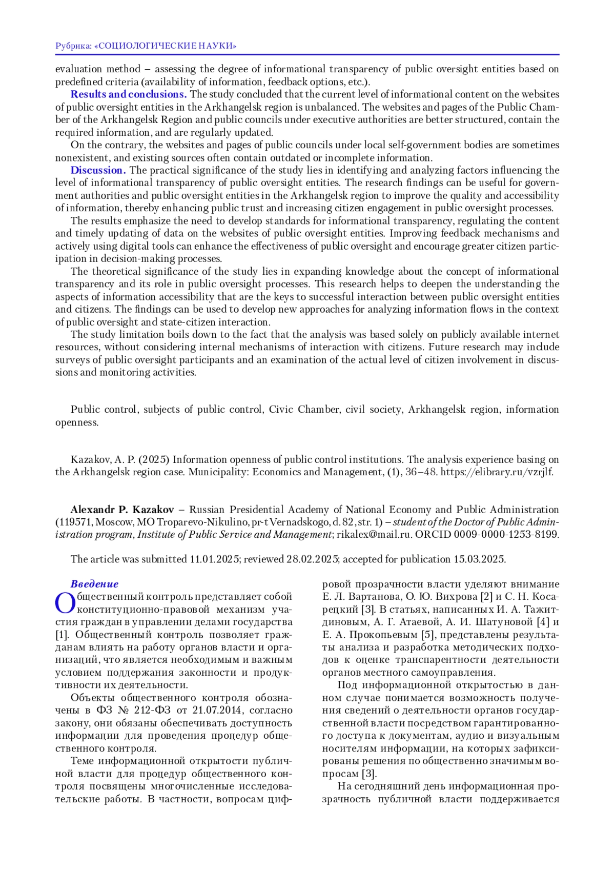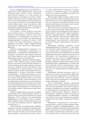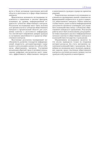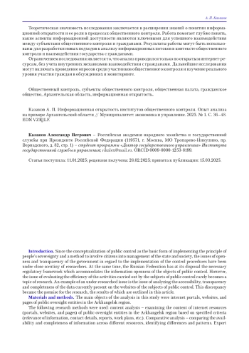 Материалы и методы. Основными объектами анализа данного исследования выступили интернет-порталы, сайты, страницы субъектов общественного контроля Архангельской области. Применялись следующие методы исследования: контент-анализ - изучение содержания интернет-ресурсов (порталов, сайтов, страниц) субъектов общественного контроля Архангельской области по заданным критериям (актуальность информации, контактные данные, отчёты, планы работы и т. д.); сравнительный анализ - сопоставление доступности и полноты информации на разных ресурсах, выявление различий и закономерностей; метод экспертной оценки - определение степени информационной открытости субъектов общественного контроля на основе заранее сформулированных критериев (наличие информации, возможность обратной связи и т. д.). Результаты и выводы. В результате исследования был сделан вывод о том, что текущий уровень информационного наполнения сайтов субъектов общественного контроля в Архангельской области не сбалансирован. Лучше оформлены, содержат обязательную для размещения информацию и регулярно обновляются страницы и сайты общественной палаты Архангельской области, общественных советов при органах исполнительной власти. Страницы и сайты общественных советов органов местного самоуправления в некоторых случаях отсутствуют, действующие источники зачастую содержат устаревшую или неполную информацию. Обсуждение. Практическая значимость исследования заключается в выявлении и анализе факторов, влияющих на уровень информационной открытости субъектов общественного контроля. Результаты исследования могут быть полезны для органов власти и субъектов общественного контроля в Архангельской области для улучшения качества и доступности информации, что способствует повышению доверия граждан и улучшению вовлечённости в процессы общественного контроля. Полученные результаты подчеркивают необходимость развития стандартов информационной открытости, регламентирующих содержание и актуализацию данных на сайтах субъектов общественного контроля. Улучшение механизмов обратной связи и активное использование цифровых инструментов могут повысить эффективность общественного контроля и вовлеченность граждан в процессы принятия решений. Теоретическая значимость исследования заключается в расширении знаний о понятии информационной открытости и ее роли в процессах общественного контроля. Работа помогает глубже понять, какие аспекты информационной доступности являются ключевыми для успешного взаимодействия между субъектами общественного контроля и гражданами. Результаты работы могут быть использованы для разработки новых подходов к анализу информационных потоков в контексте общественного контроля и взаимодействия государства с гражданами. Ограничением исследования является то, что анализ проводился только по открытым интернет-ресурсам, без учета внутренних механизмов взаимодействия с гражданами. Дальнейшие исследования могут включать проведение опросов среди участников общественного контроля и изучение реального уровня участия граждан в обсуждениях и мониторинге.