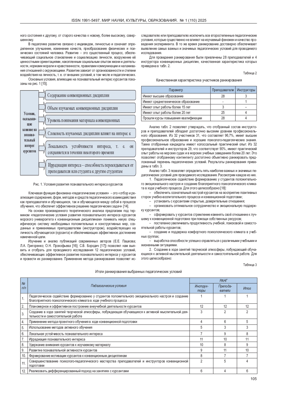 В статье рассматриваются педагогические условия развития познавательного интереса курсантов морского университета к конвенционным дисциплинам. Формирование будущего специалиста морского транспорта в процессе обучения в морской образовательной организации как настоящего компетентного профессионала требует привить и развить у него в процессе обучения познавательный интерес к конвенционной подготовке, стремление к поиску и получению новых знаний. Цель исследования: обоснование и раскрытие совокупности педагогических условий, способствующих развитию познавательного интереса курсантов к конвенционным дисциплинам. Применены следующие методы: теоретические (изучение научных публикаций российских ученых; теоретический анализ; синтез; обобщение; ранжирование) и эмпирические (опрос; индивидуальные беседы). Результат исследования - совокупность педагогических условий развития познавательного интереса курсантов морского университета к конвенционным дисциплинам. Полученные результаты обладают научной новизной, теоретической и практической значимостью. Разработанные научные положения направлены на повышение качества и результативность профессиональной подготовки курсантов и представляют интерес для преподавательского и инструкторского составов всех видов учебных заведений.