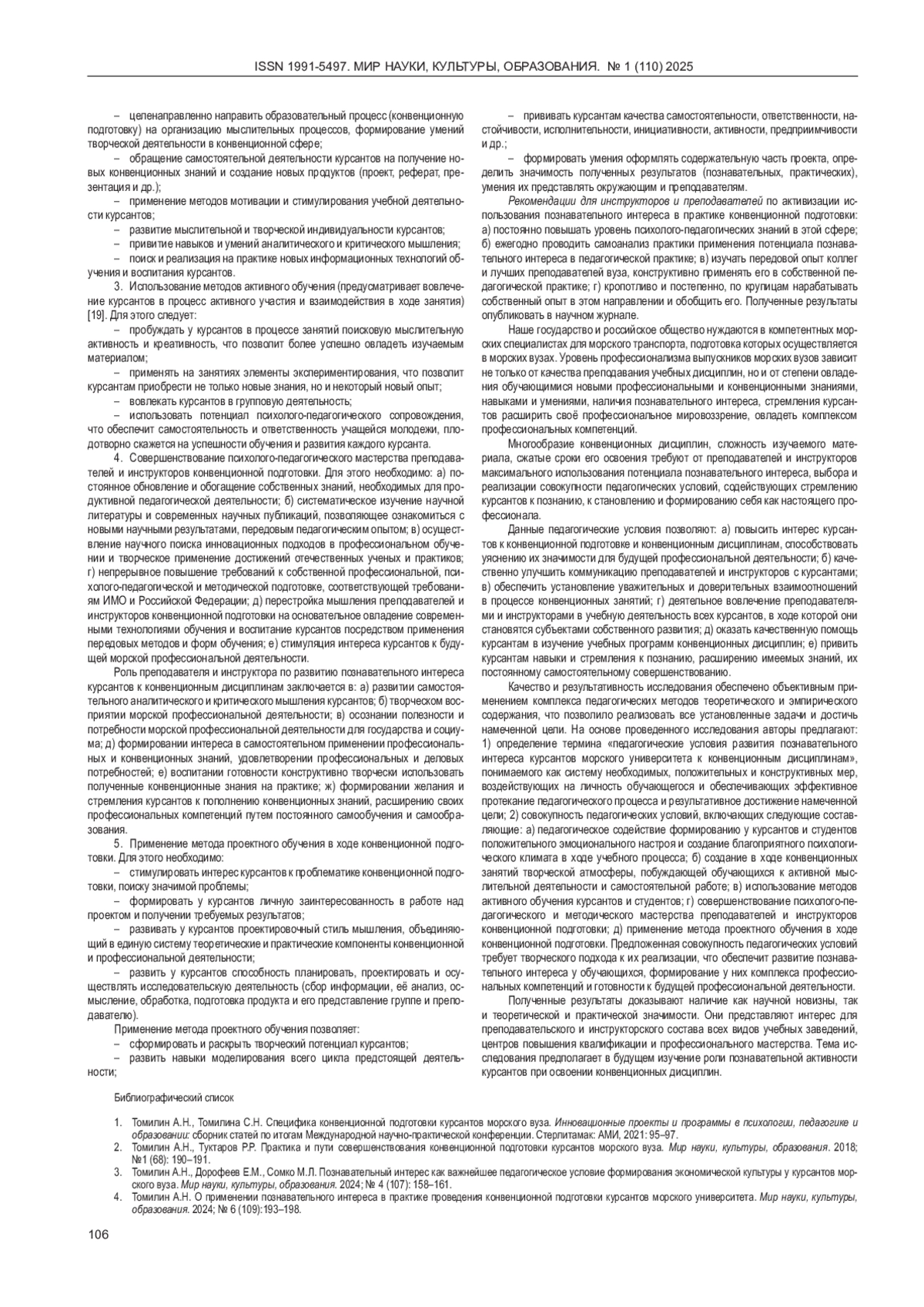 4. 	Томилин А.Н. О применении познавательного интереса в практике проведения конвенционной подготовки курсантов морского университета. Мир науки, культуры, образования. 2024; № 6 (109):193-198. EDN: MQNVJO