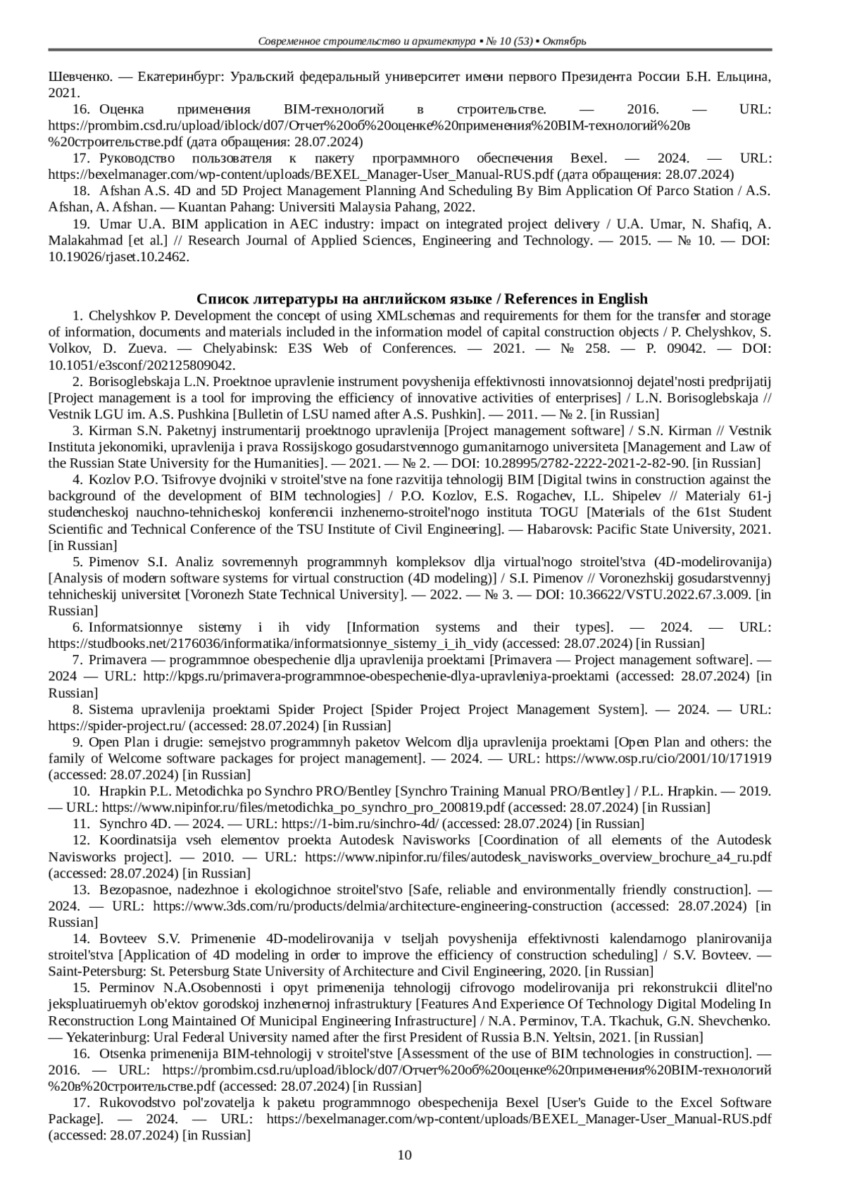 14. Bovteev S.V. Primenenie 4D-modelirovanija v tseljah povyshenija effektivnosti kalendarnogo planirovanija stroitel’stva [Application of 4D modeling in order to improve the efficiency of construction scheduling] / S.V. Bovteev. — Saint-Petersburg: St. Petersburg State University of Architecture and Civil Engineering, 2020. [in Russian]