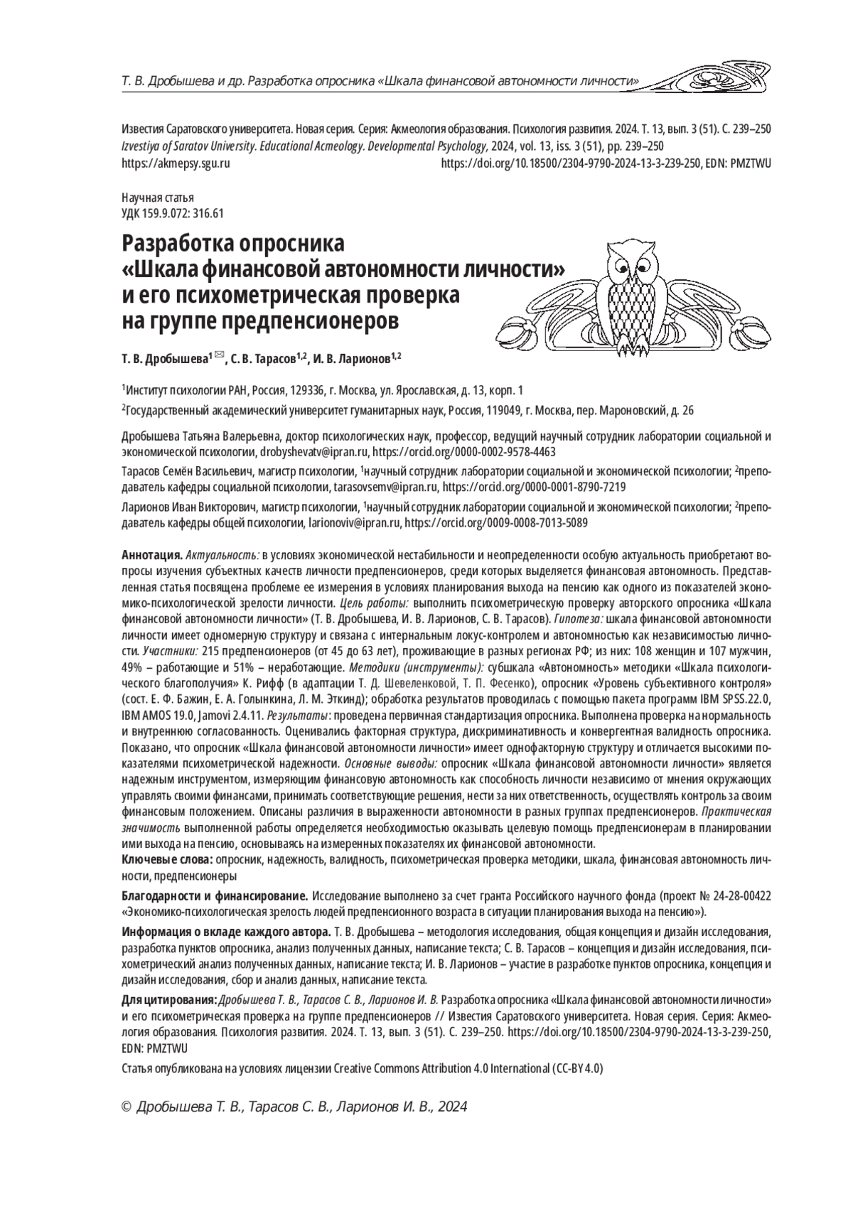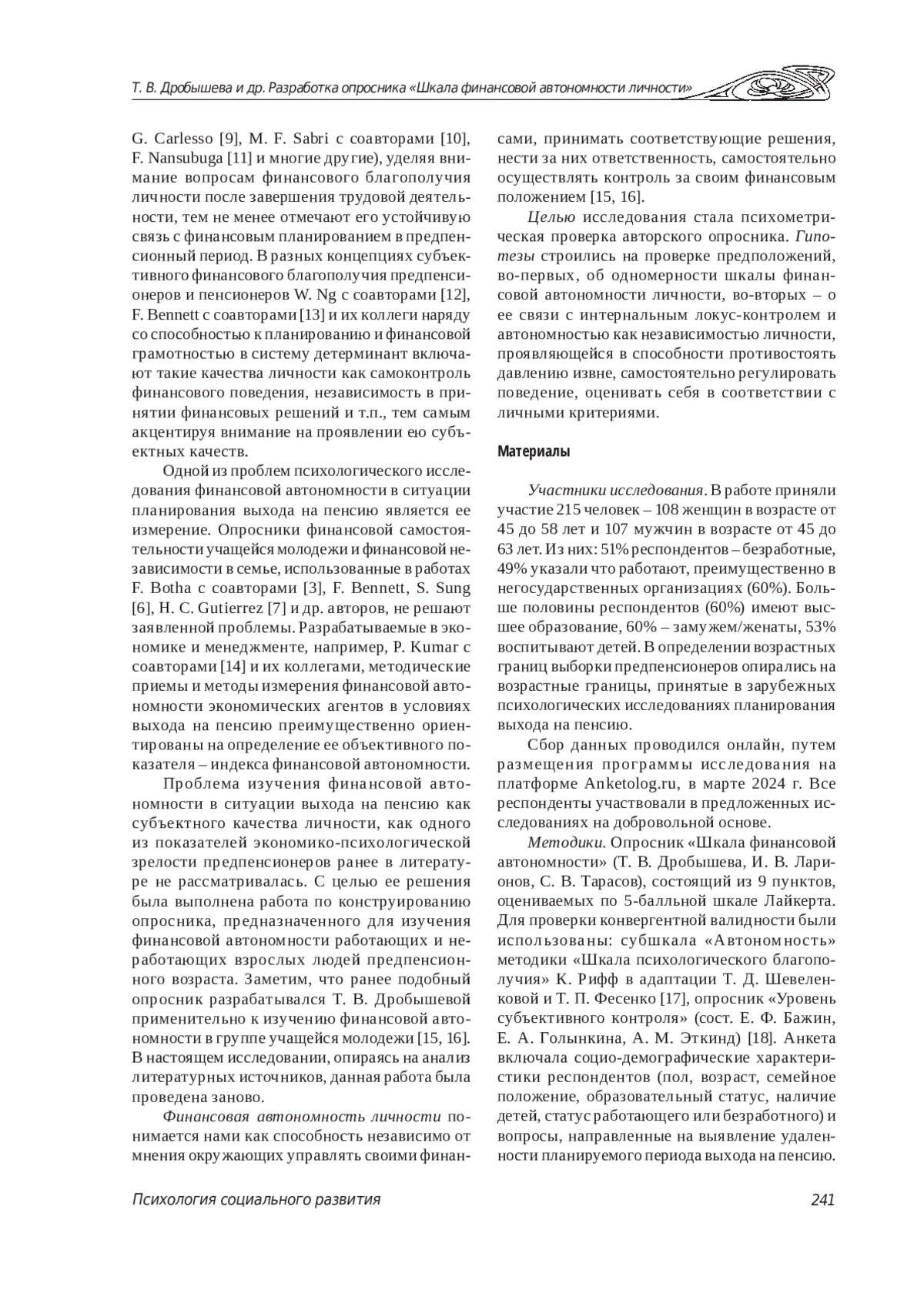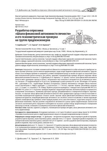 15. 	Дробышева Т. В. Понятие “экономико-психологическая зрелость” личности и его операционализация // Вестник Московского государственного областного университета. Серия: Психологические науки. 2021. № 1. С. 74-83. ,. DOI: 10.18384/2310-7235-2021-1-74-83 EDN: CMFQPJ