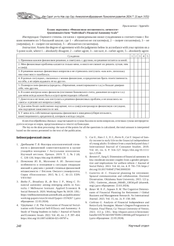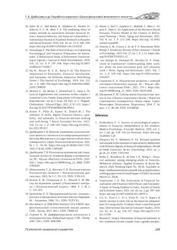 4. 	Vijaykumar J. H. The Association of Financial Socialization with Financial Self-Effi cacy and Autonomy: A Study of Young Students in India // Journal of Family and Economic Issues. 2022. Vol. 43, iss. 2. P. 397-414. DOI: 10.1007/s10834-021-09797-x EDN: ZYXUEV
