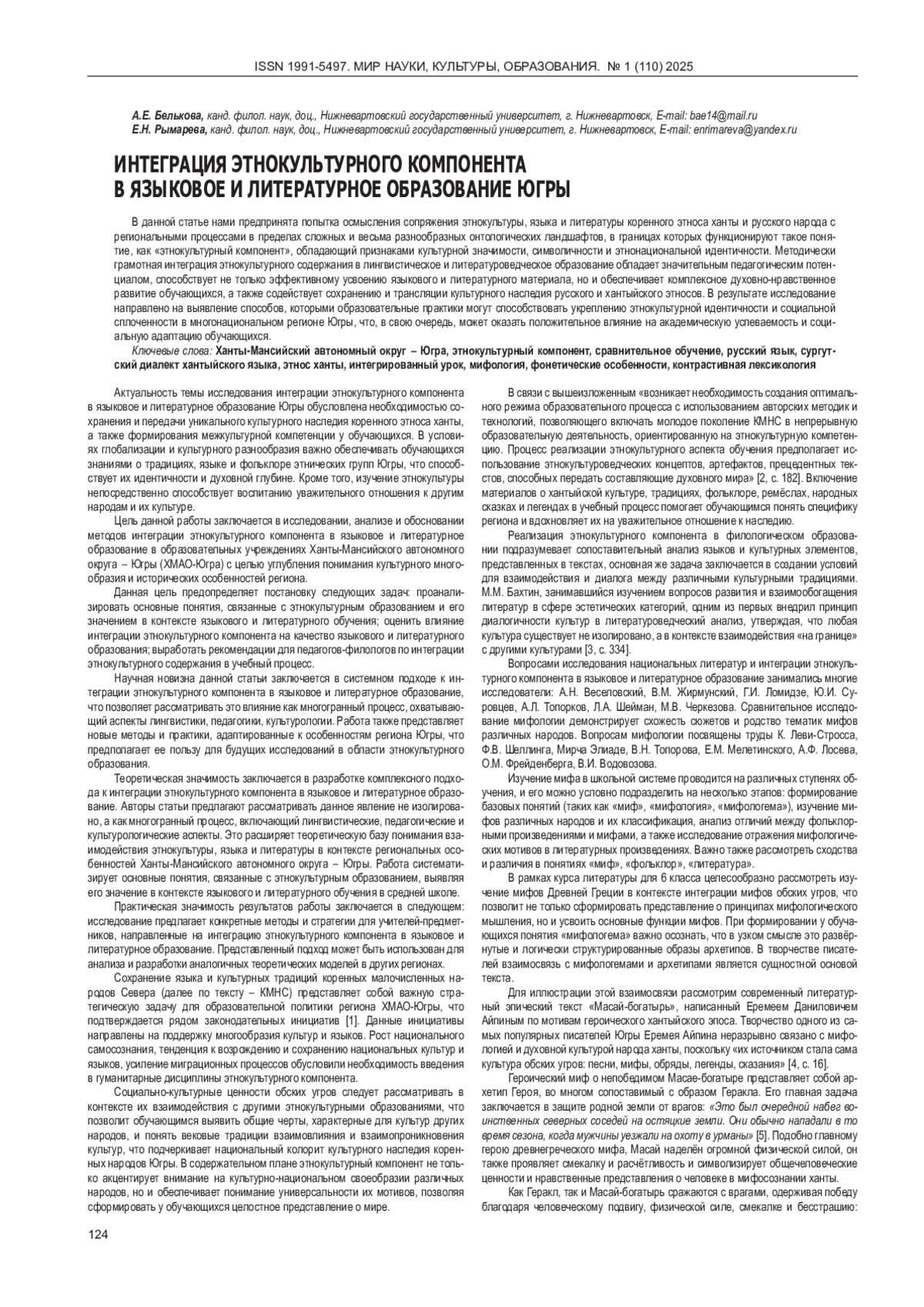 В данной статье нами предпринята попытка осмысления сопряжения этнокультуры, языка и литературы коренного этноса ханты и русского народа с региональными процессами в пределах сложных и весьма разнообразных онтологических ландшафтов, в границах которых функционируют такое понятие, как «этнокультурный компонент», обладающий признаками культурной значимости, символичности и этнонациональной идентичности. Методически грамотная интеграция этнокультурного содержания в лингвистическое и литературоведческое образование обладает значительным педагогическим потенциалом, способствует не только эффективному усвоению языкового и литературного материала, но и обеспечивает комплексное духовно-нравственное развитие обучающихся, а также содействует сохранению и трансляции культурного наследия русского и хантыйского этносов. В результате исследование направлено на выявление способов, которыми образовательные практики могут способствовать укреплению этнокультурной идентичности и социальной сплоченности в многонациональном регионе Югры, что, в свою очередь, может оказать положительное влияние на академическую успеваемость и социальную адаптацию обучающихся.