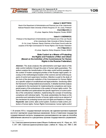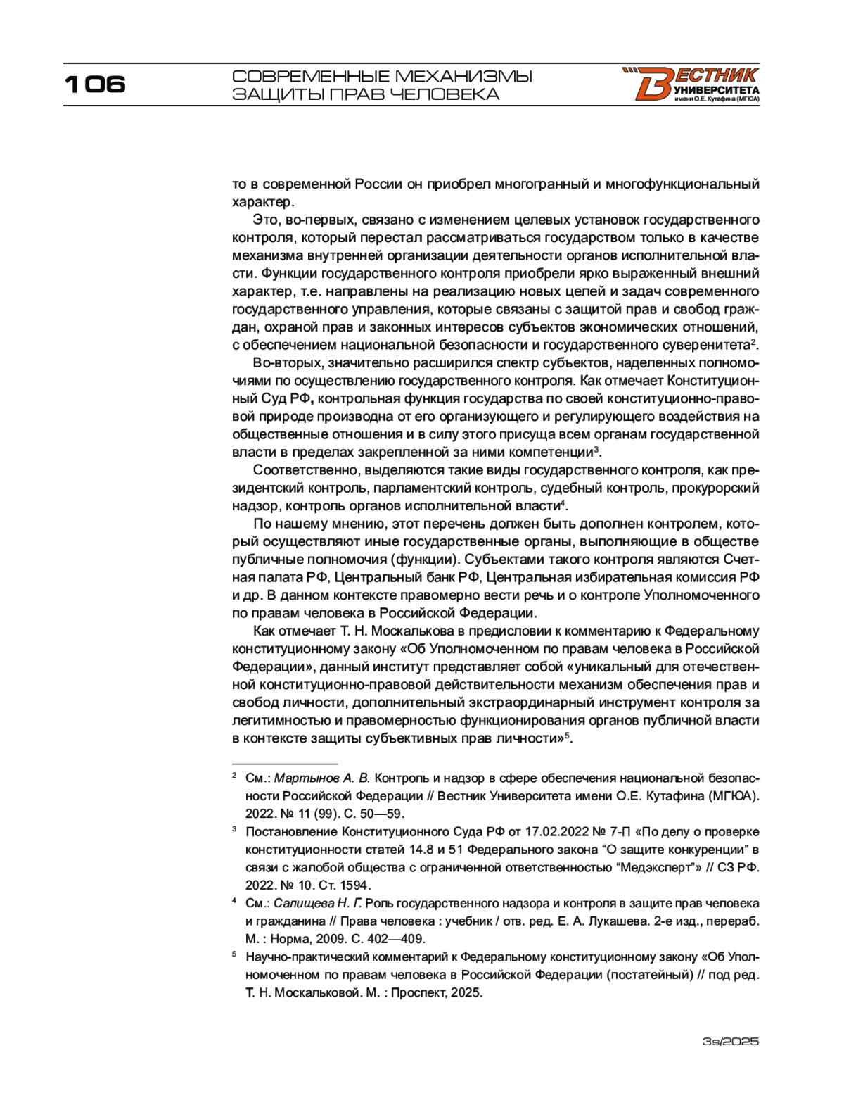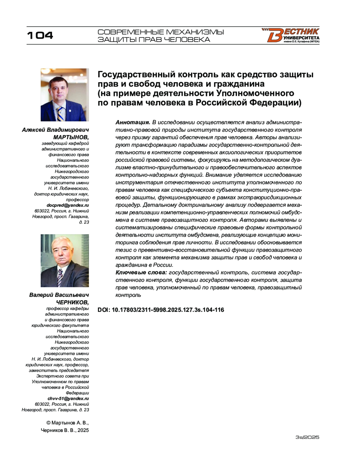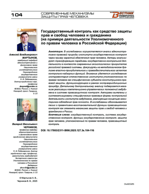 ЧЕРНИКОВ В. В., МАРТЫНОВ А. В. ГОСУДАРСТВЕННЫЙ КОНТРОЛЬ КАК СРЕДСТВО ЗАЩИТЫ ПРАВ И СВОБОД ЧЕЛОВЕКА И ГРАЖДАНИНА (НА ПРИМЕРЕ ДЕЯТЕЛЬНОСТИ УПОЛНОМОЧЕННОГО ПО ПРАВАМ ЧЕЛОВЕКА В РОССИЙСКОЙ ФЕДЕРАЦИИ) // ВЕСТНИК УНИВЕРСИТЕТА ИМЕНИ О.Е. КУТАФИНА (МГЮА). 2025. № 3S