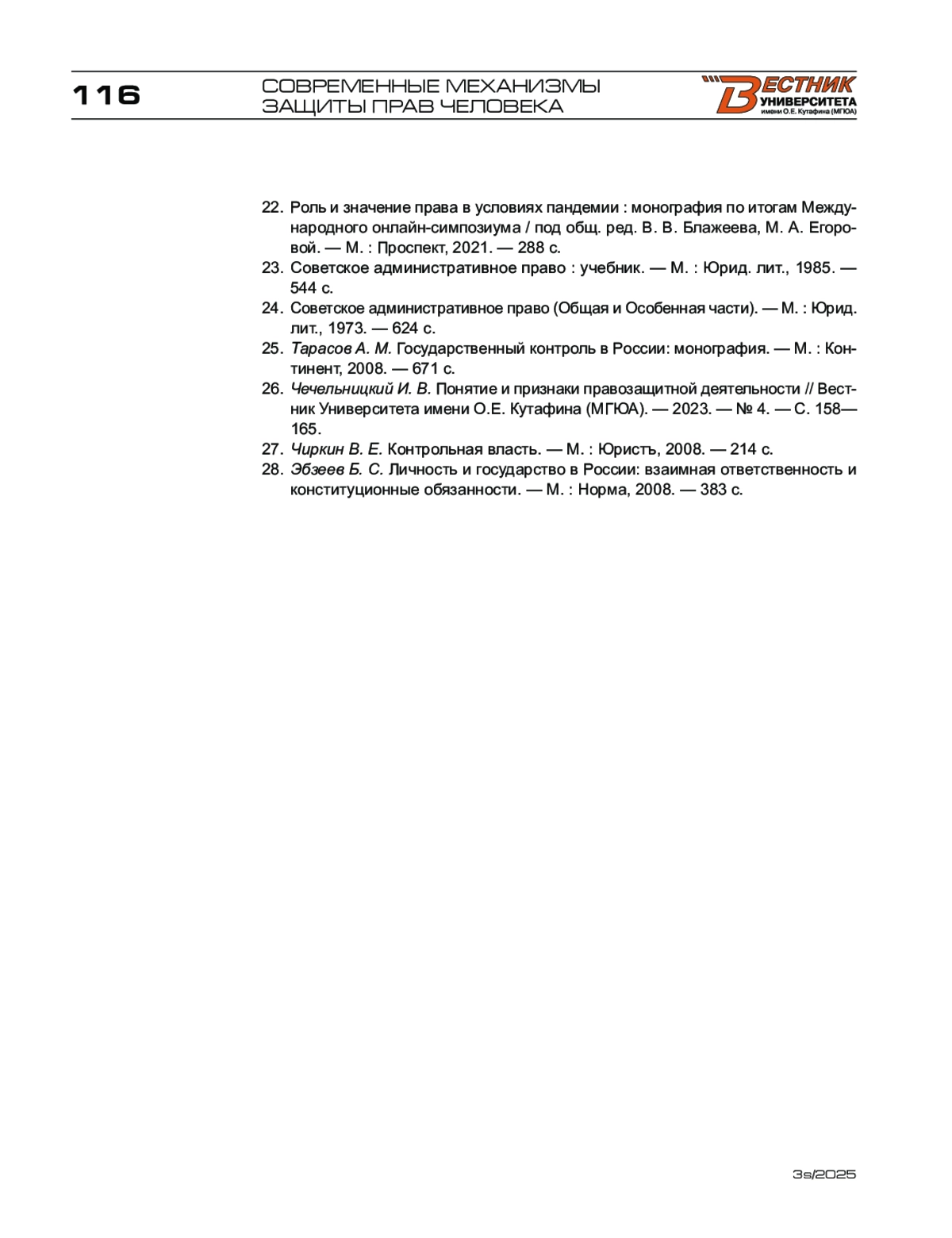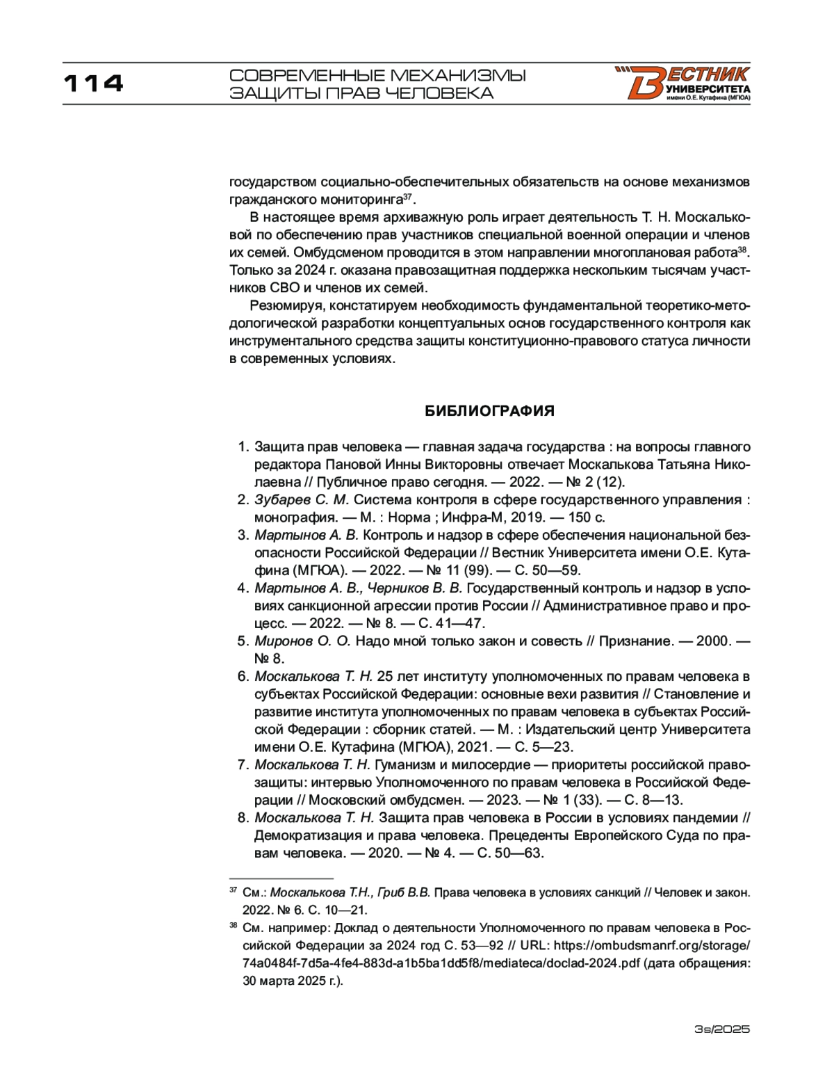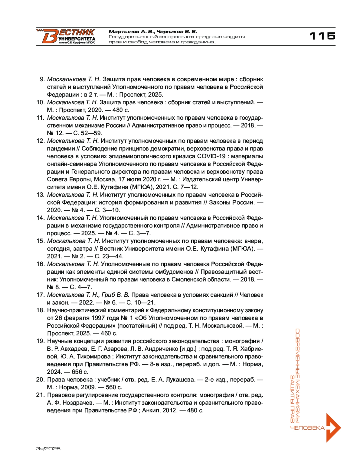 ЧЕРНИКОВ В. В., МАРТЫНОВ А. В. ГОСУДАРСТВЕННЫЙ КОНТРОЛЬ КАК СРЕДСТВО ЗАЩИТЫ ПРАВ И СВОБОД ЧЕЛОВЕКА И ГРАЖДАНИНА (НА ПРИМЕРЕ ДЕЯТЕЛЬНОСТИ УПОЛНОМОЧЕННОГО ПО ПРАВАМ ЧЕЛОВЕКА В РОССИЙСКОЙ ФЕДЕРАЦИИ) // ВЕСТНИК УНИВЕРСИТЕТА ИМЕНИ О.Е. КУТАФИНА (МГЮА). 2025. № 3S