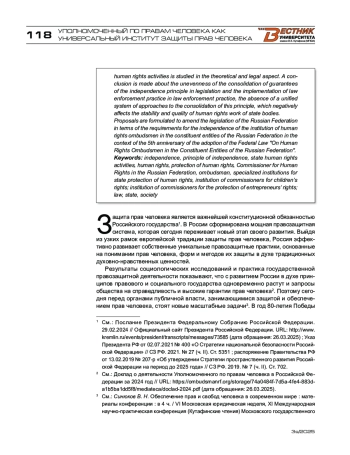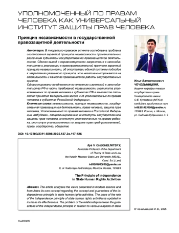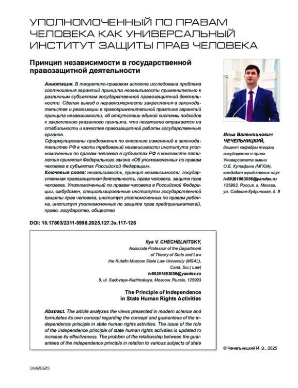 В теоретико-правовом аспекте исследована проблема соотношения гарантий принципа независимости применительно к различным субъектам государственной правозащитной деятельности. Сделан вывод о неравномерности закрепления в законодательстве и реализации в правоприменительной практике гарантий принципа независимости, об отсутствии единой системы подходов к закреплению указанного принципа, что негативно отражается на стабильности и качестве правозащитной работы государственных органов. Сформулированы предложения по внесению изменений в законодательство РФ в части требований независимости института уполномоченных по правам человека в субъектах РФ в контексте пятилетия принятия Федерального закона «Об уполномоченных по правам человека в субъектах Российской Федерации».