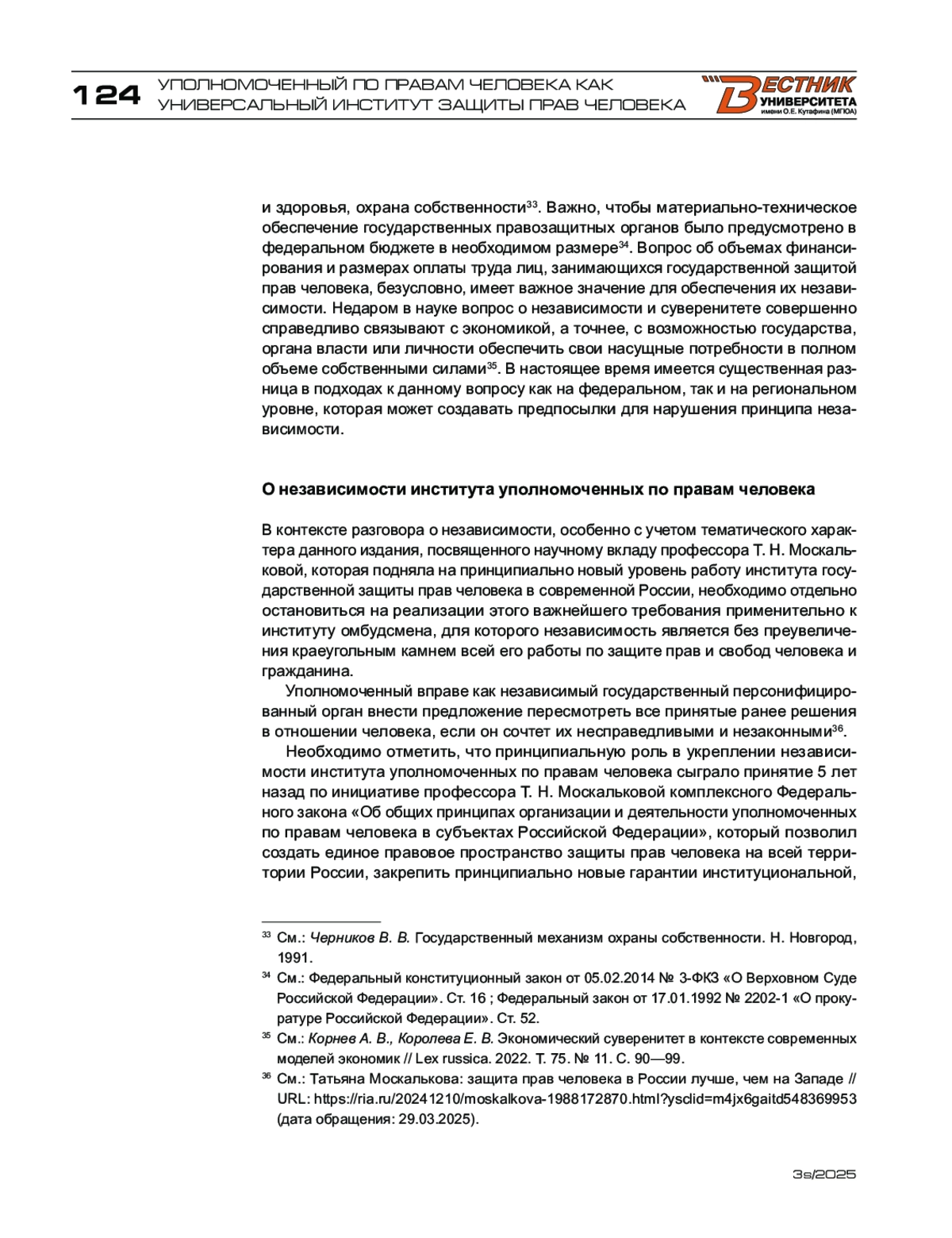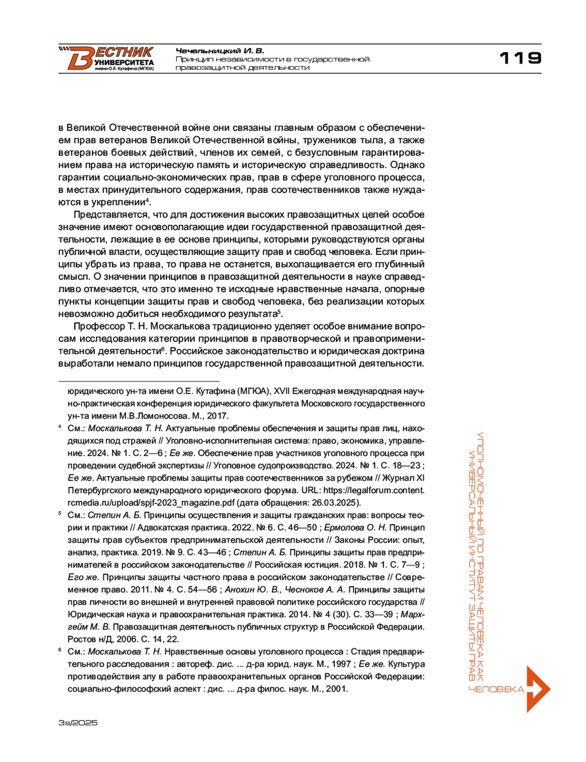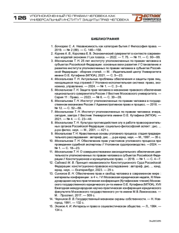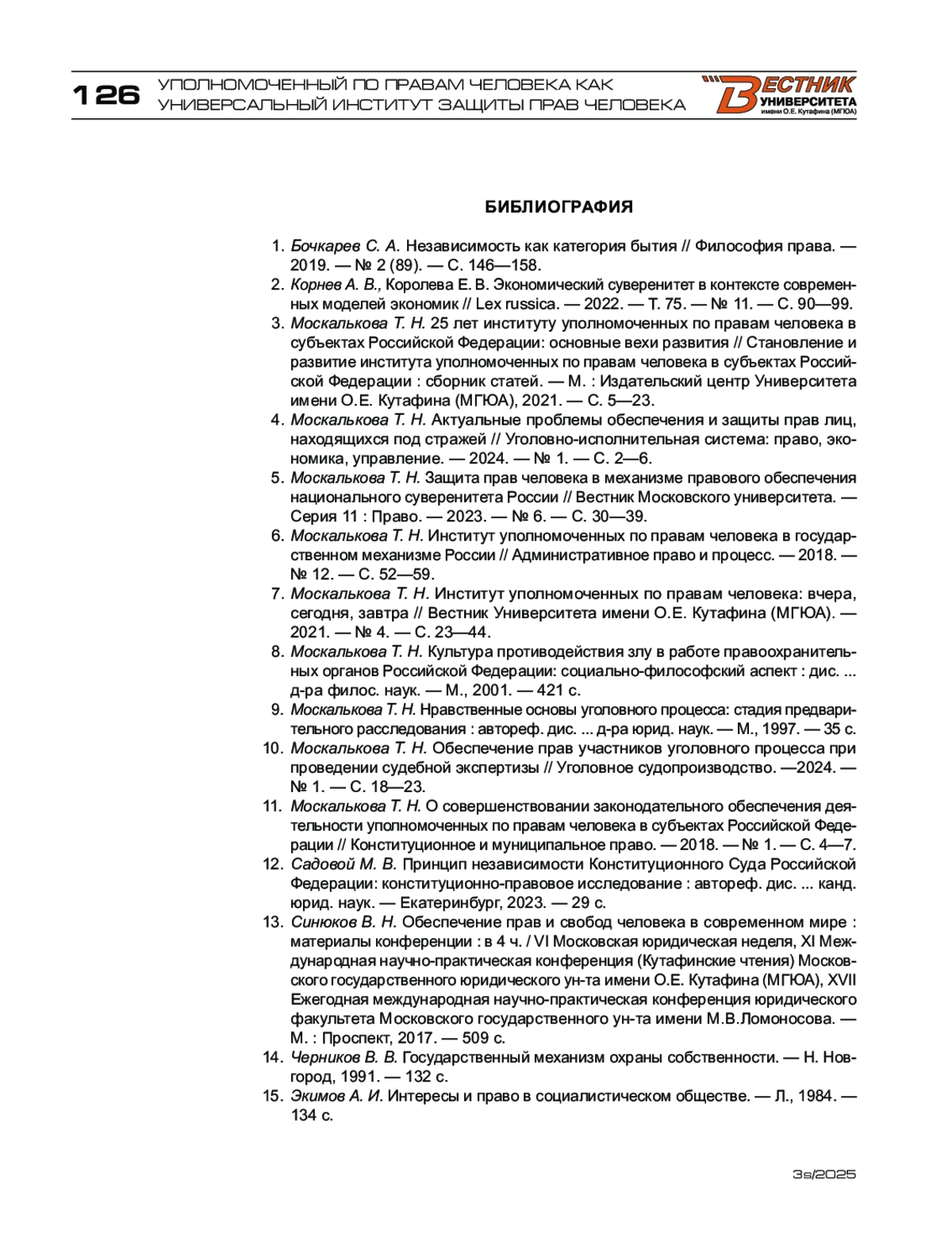 5. Москалькова Т. Н. Защита прав человека в механизме правового обеспечения национального суверенитета России // Вестник Московского университета. - Серия 11 : Право. - 2023. - № 6. - С. 30-39.