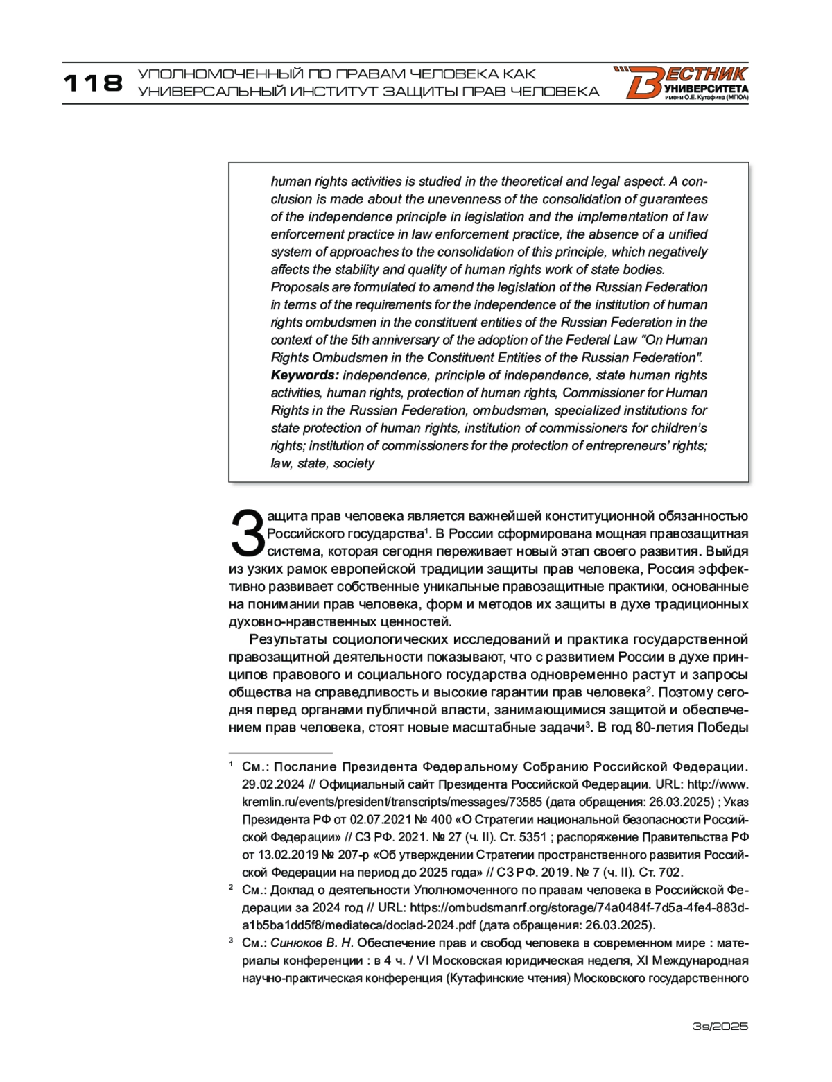 3. Москалькова Т. Н. 25 лет институту уполномоченных по правам человека в субъектах Российской Федерации: основные вехи развития // Становление и развитие института уполномоченных по правам человека в субъектах Российской Федерации : сборник статей. - М. : Издательский центр Университета имени О.Е. Кутафина (МГЮА), 2021. - С. 5-23.