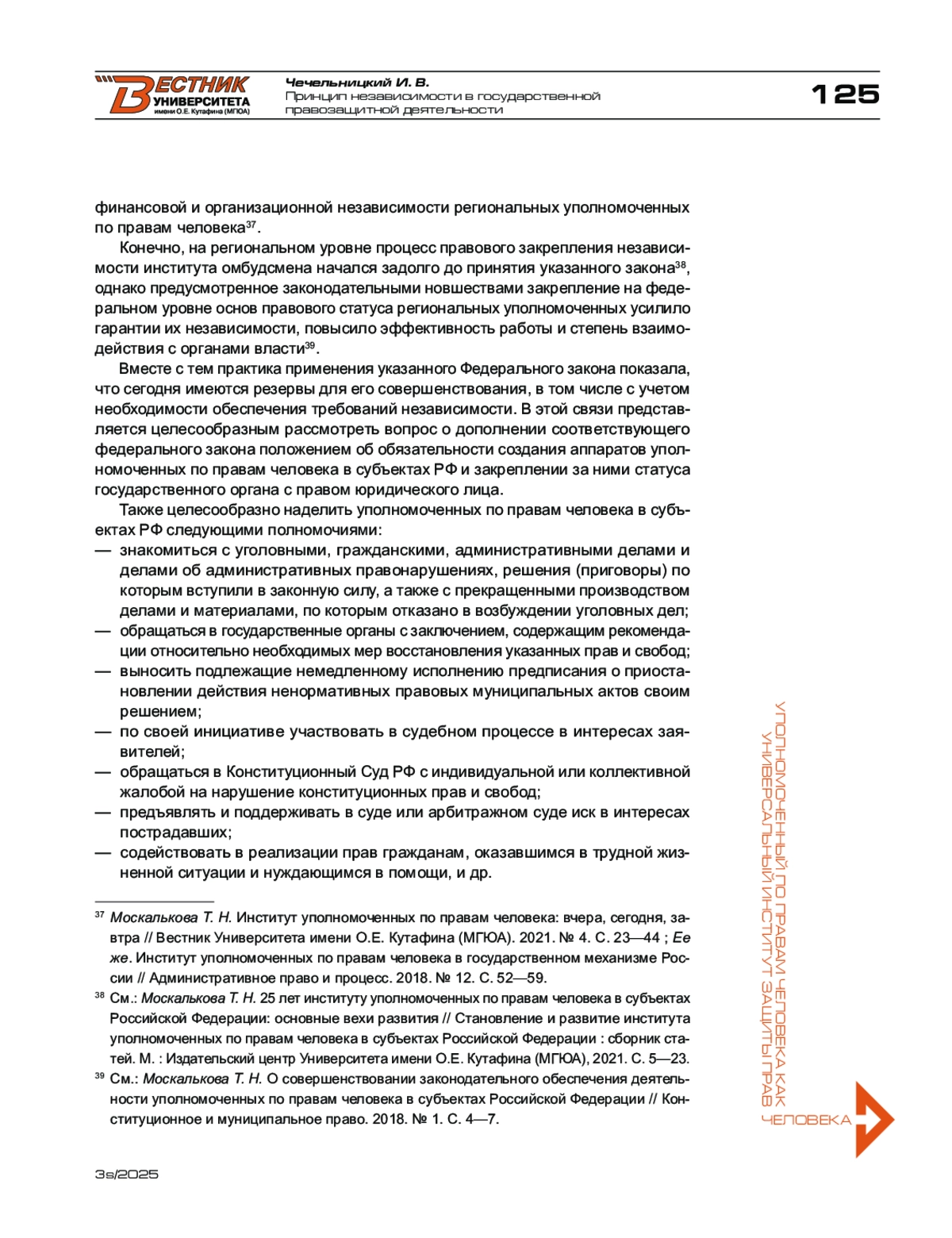 11. Москалькова Т. Н. О совершенствовании законодательного обеспечения деятельности уполномоченных по правам человека в субъектах Российской Федерации // Конституционное и муниципальное право. - 2018. - № 1. - С. 4-7.
