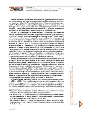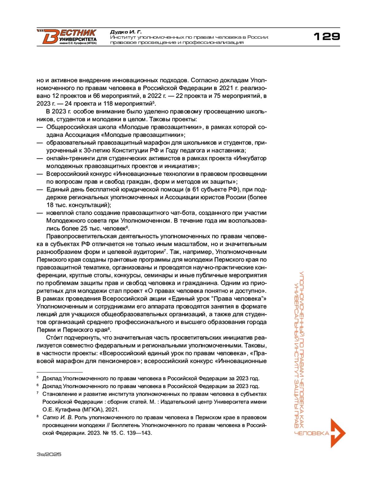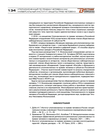 1. Дудко И. Г. Институт уполномоченных по правам человека в России: концептуальные основы и эволюция // Конституционное и муниципальное право. - 2024. - № 10. - С. 11-18.