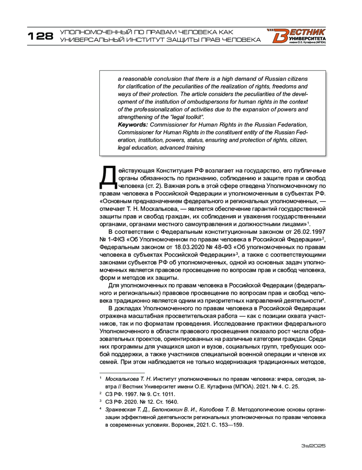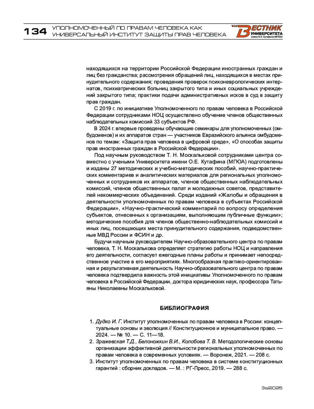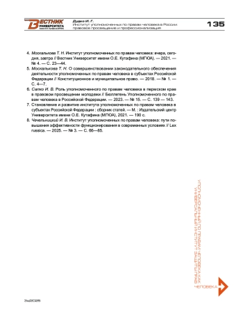 4. Москалькова Т. Н. Институт уполномоченных по правам человека: вчера, сего дня, завтра // Вестник Университет имени О.Е. Кутафина (МГЮА). - 2021. - № 4. - С. 23-44.