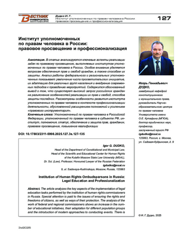 В статье анализируются ключевые аспекты реализации задач по правовому просвещению, выполняемых институтом уполномоченных по правам человека в России. Особое внимание уделяется вопросам обеспечения прав и свобод граждан, а также способам их защиты. Анализ работы федерального и региональных уполномоченных показывает увеличение числа просветительских инициатив, их адаптацию для различных групп населения и внедрение современных подходов к проведению мероприятий. Содержится обоснованный вывод о том, что существует высокий запрос российских граждан на разъяснение особенностей реализации их прав и свобод, способов защиты последних. Рассмотрены особенности развития института уполномоченных по правам человека в контексте профессионализации деятельности, обусловленной расширением полномочий и усилением «правового инструментария».