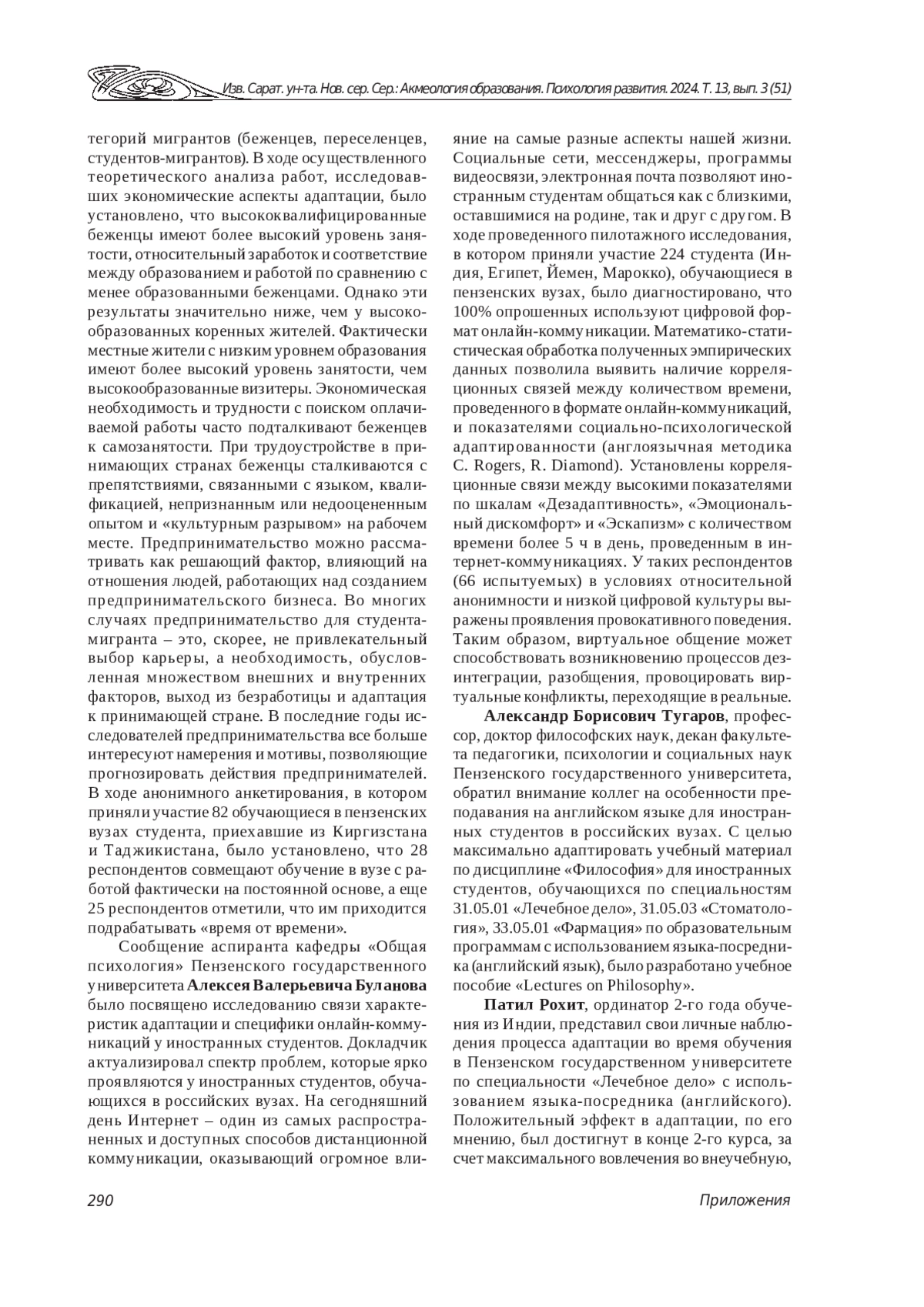 Актуальность исследования определяет необходимость содействия поиску инструментов, повышающих эффективность психологического сопровождения и адаптации иностранных студентов в российских вузах, что стало главной идеей межрегионального круглого стола «Психологическое сопровождение иностранных студентов в российских вузах» (Пензенский государственный университет, 25 апреля 2024 г.).