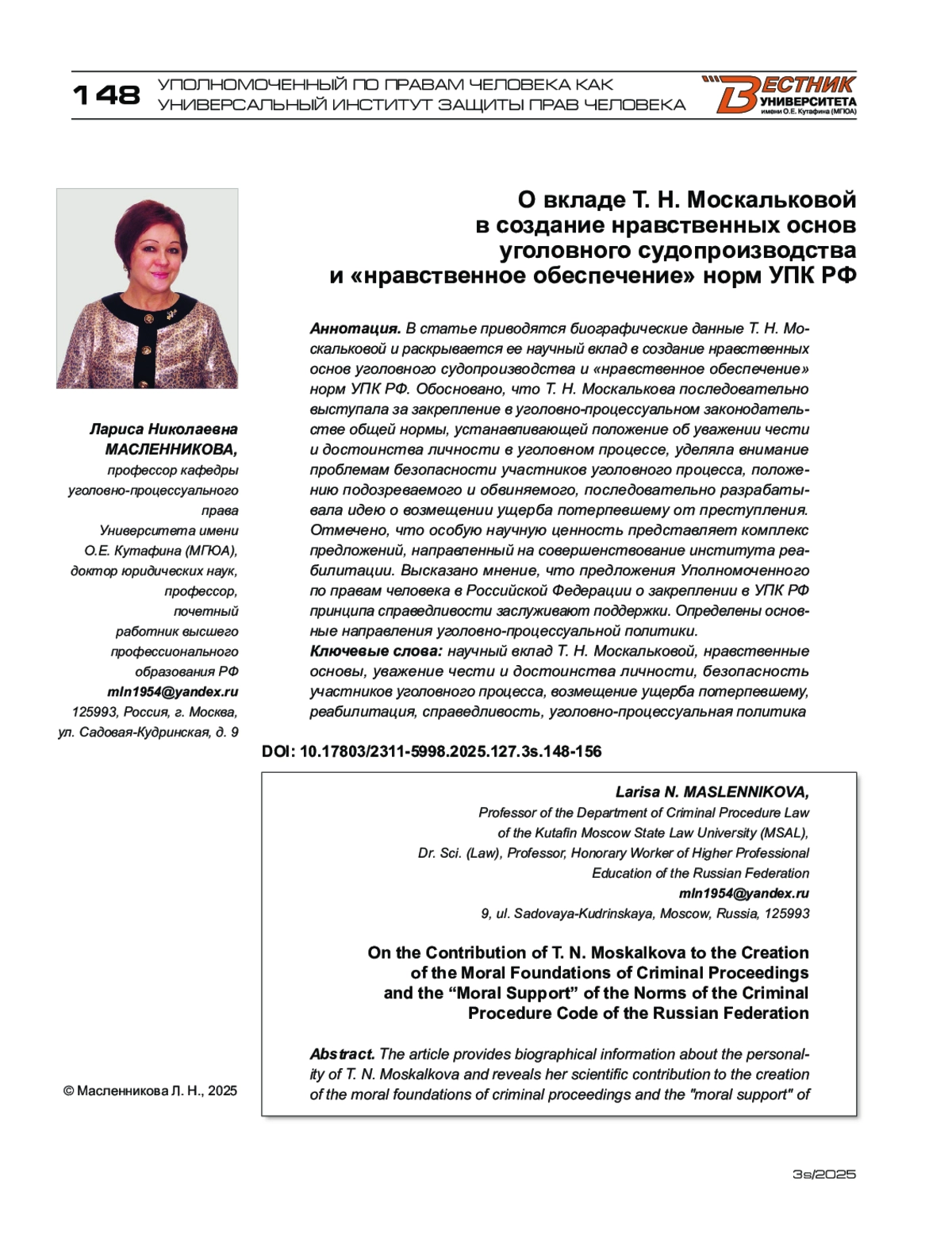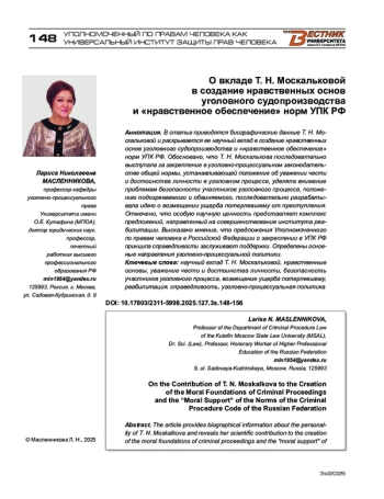 Автор рассматривает вопросы вклада в науку российского уголовного процесса доктора юридических наук, доктора философских наук, профессора Т. Н. Москальковой, которая в своих диссертациях на соискание ученой степени кандидата и доктора юридических наук исследует вопросы обеспечения прав и законных интересов участников уголовного судопроизводства. Результаты ее научных изысканий в части возмещения ущерба, причиненного незаконным задержанием, компенсации за моральный ущерб, причиненный незаконным привлечением к уголовной ответственности, и ряд других были реализованы в положениях главы 18 Уголовно-процессуального кодекса РФ.