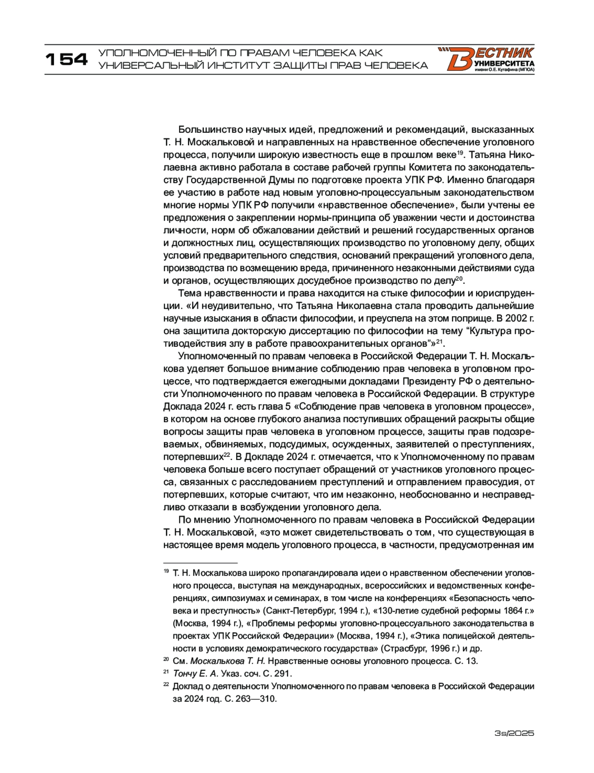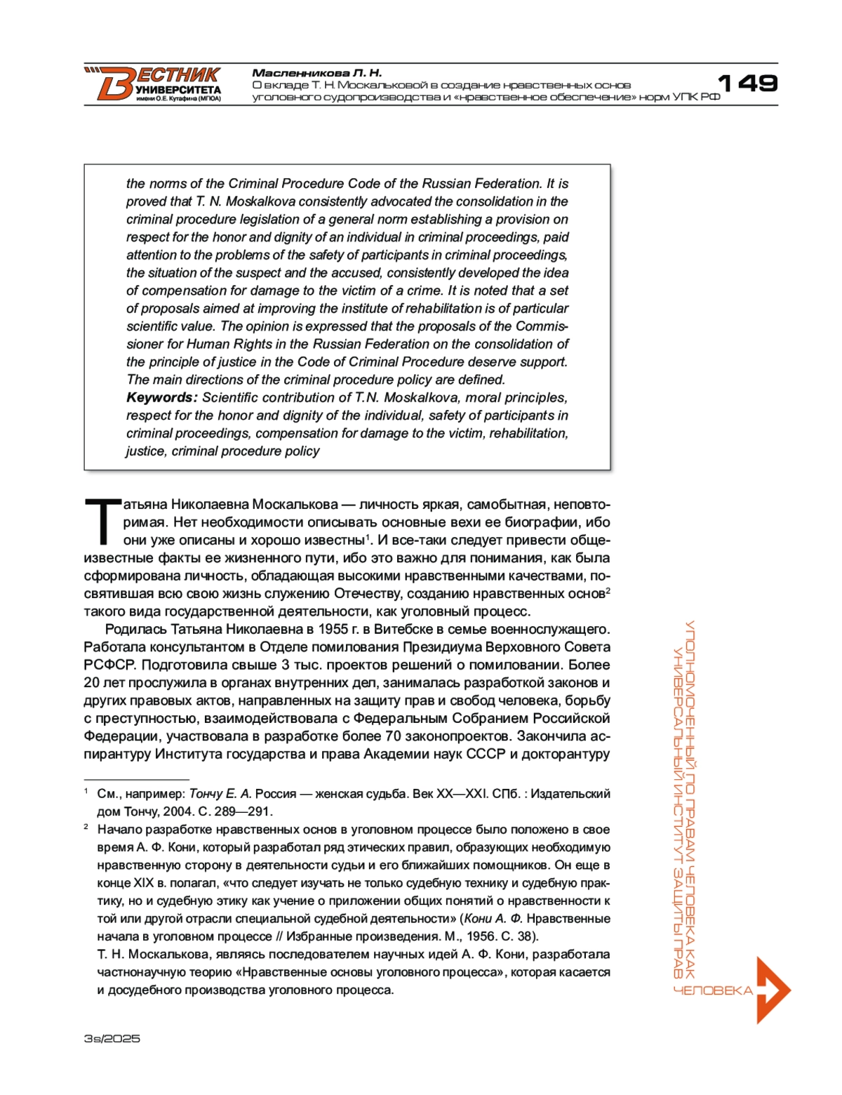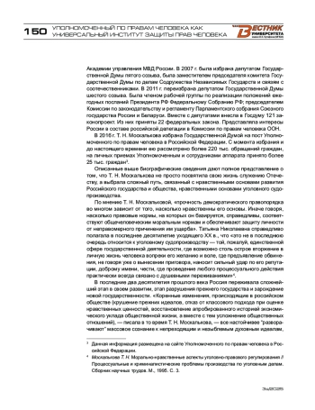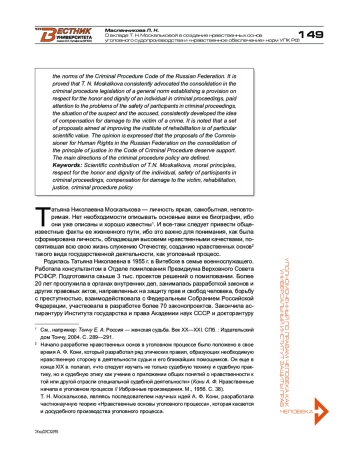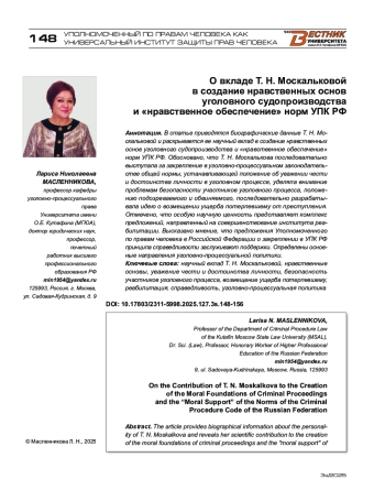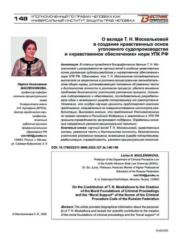 В статье приводятся биографические данные Т. Н. Москальковой и раскрывается ее научный вклад в создание нравственных основ уголовного судопроизводства и «нравственное обеспечение» норм УПК РФ. Обосновано, что Т. Н. Москалькова последовательно выступала за закрепление в уголовно-процессуальном законодательстве общей нормы, устанавливающей положение об уважении чести и достоинства личности в уголовном процессе, уделяла внимание проблемам безопасности участников уголовного процесса, положению подозреваемого и обвиняемого, последовательно разрабатывала идею о возмещении ущерба потерпевшему от преступления. Отмечено, что особую научную ценность представляет комплекс предложений, направленный на совершенствование института реабилитации. Высказано мнение, что предложения Уполномоченного по правам человека в Российской Федерации о закреплении в УПК РФ принципа справедливости заслуживают поддержки. Определены основные направления уголовно-процессуальной политики.