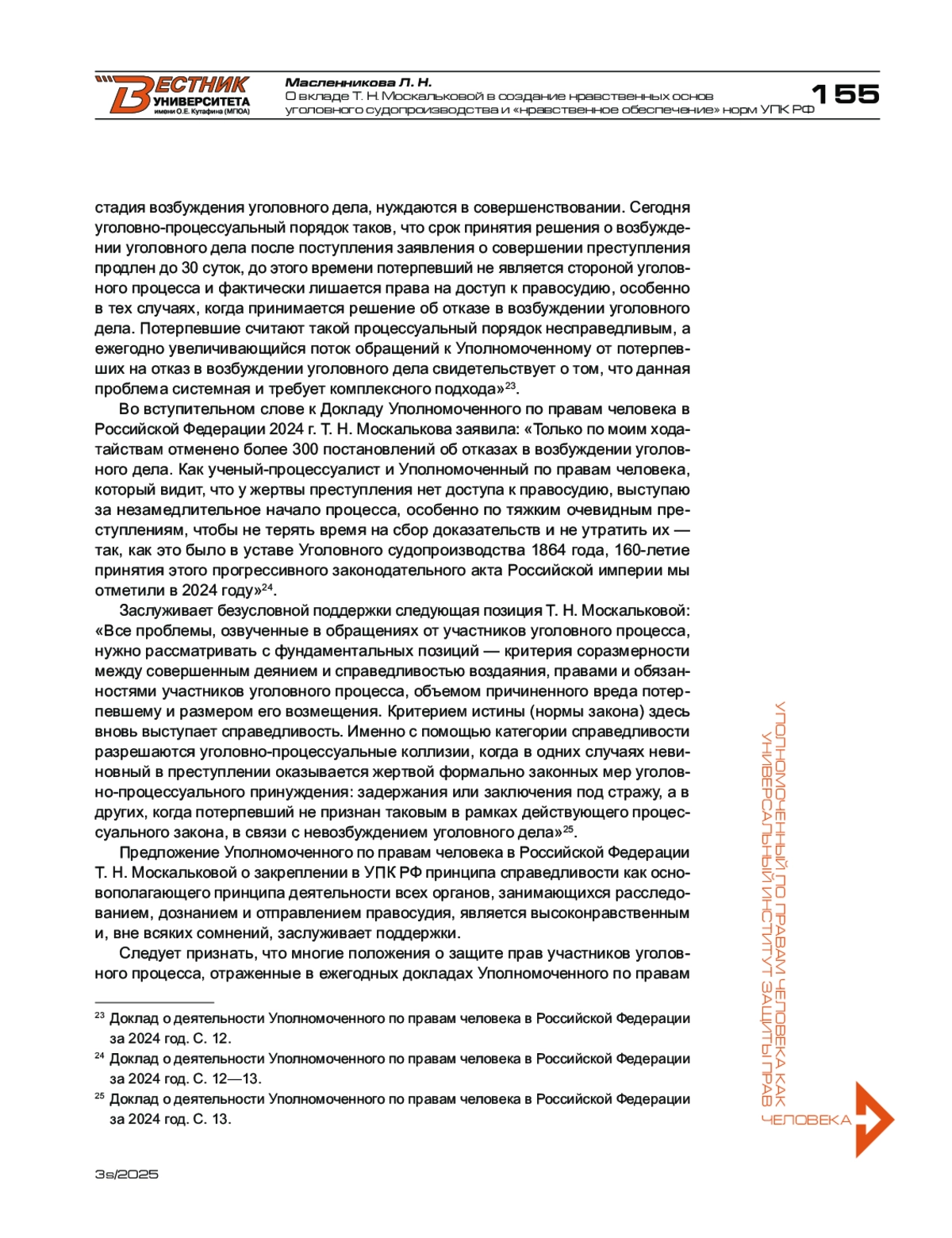 Как Уполномоченный по правам человека в Российской Федерации Т. Н. Москалькова уделяет особое внимание вопросам обеспечения доступа граждан к правосудию, реализацию которых она видит через внесение изменений в процессуальные правила начала производства по уголовному делу.