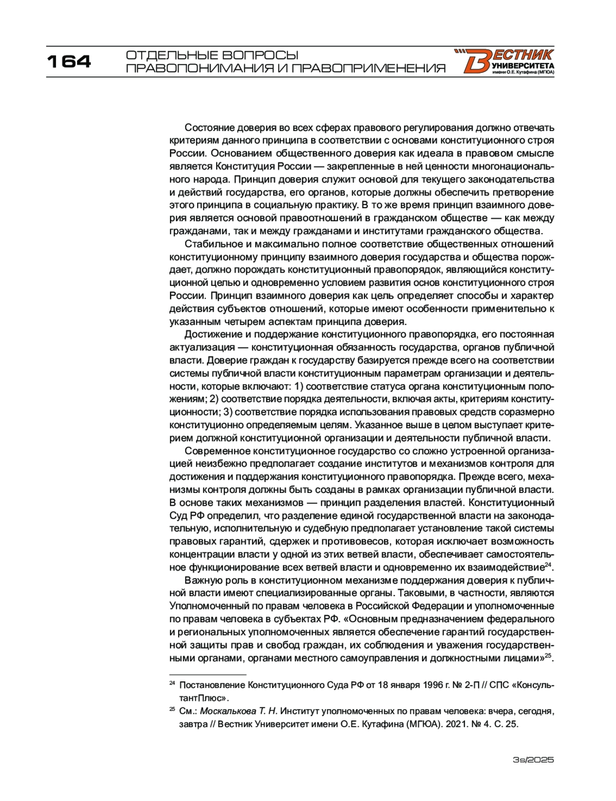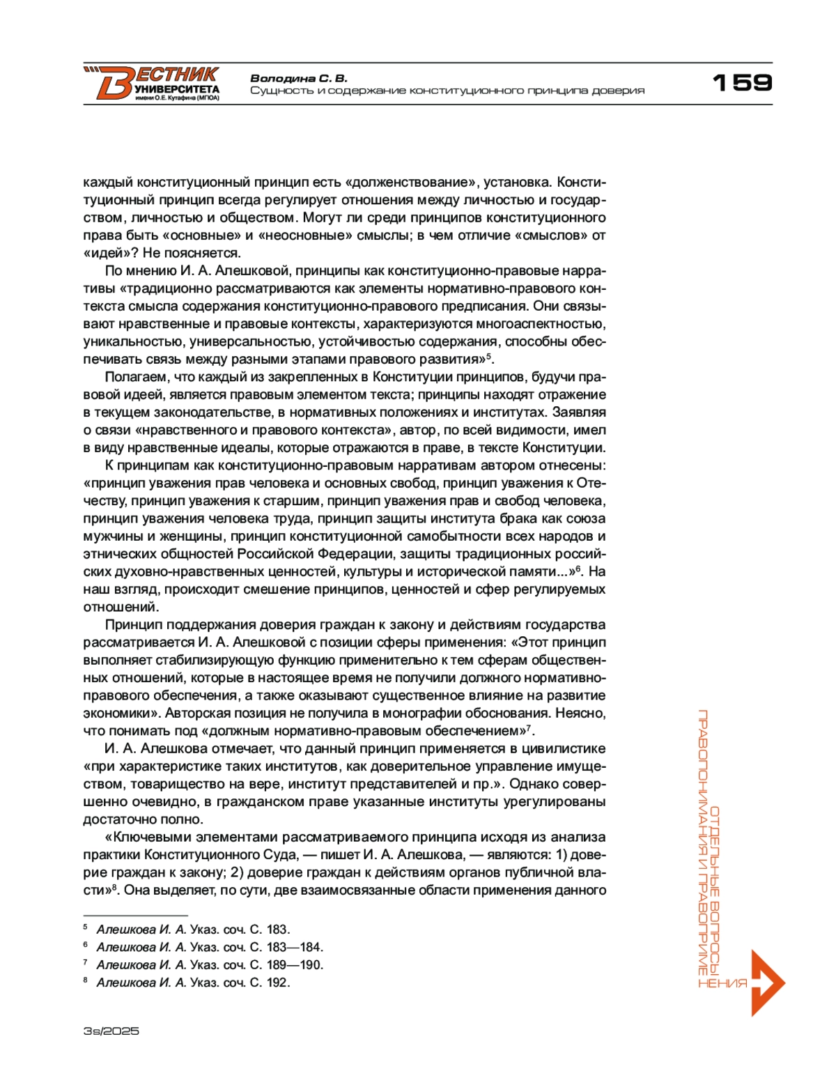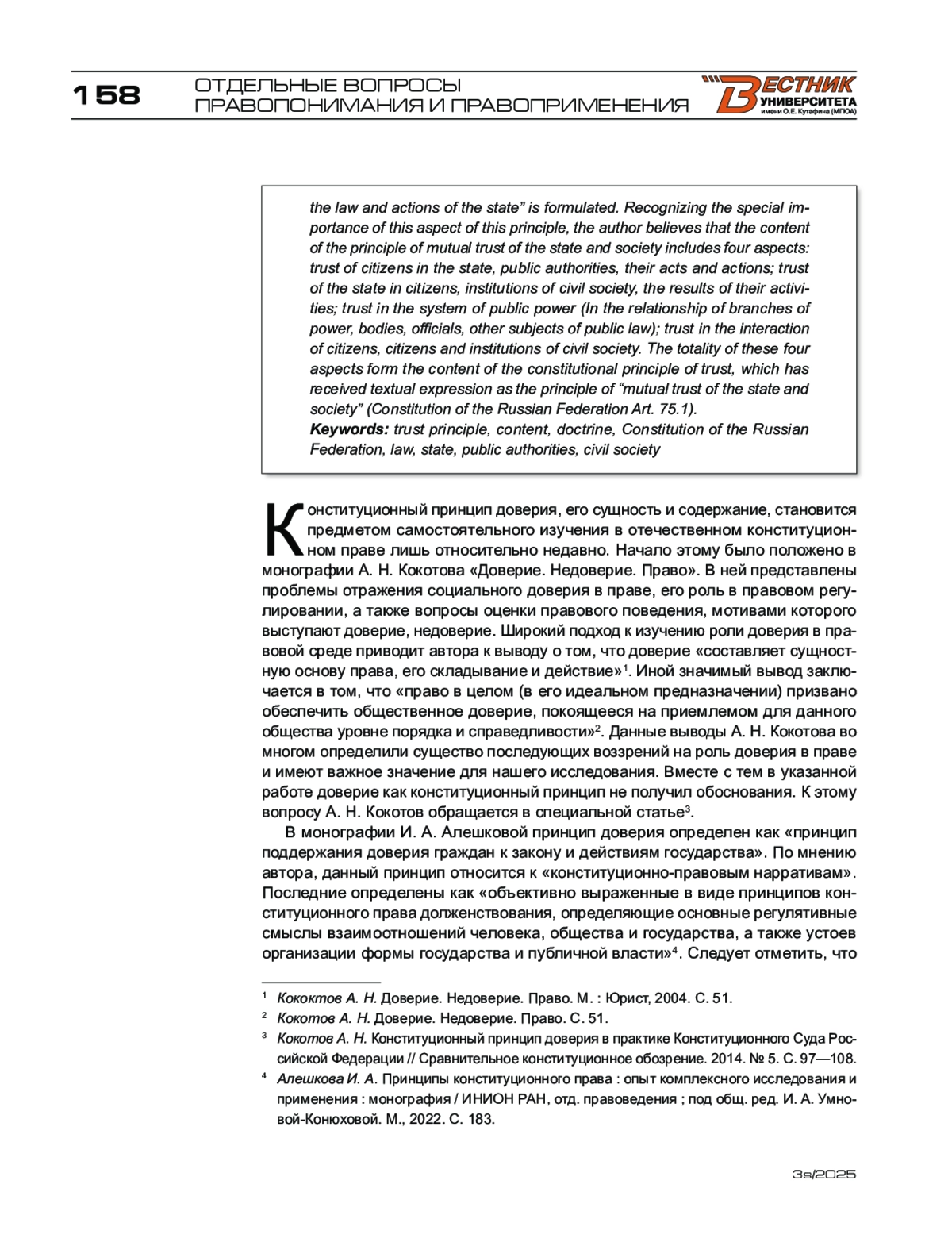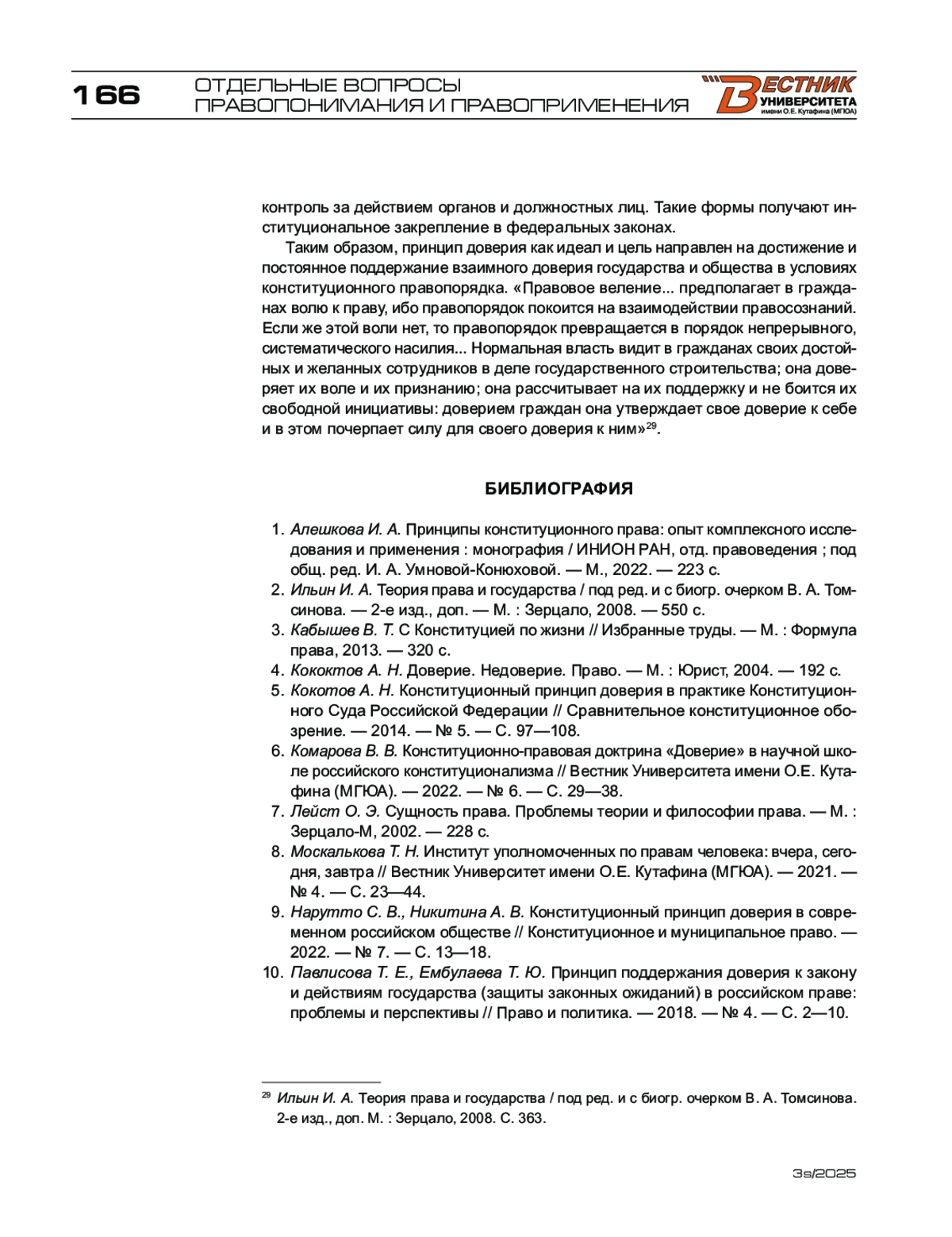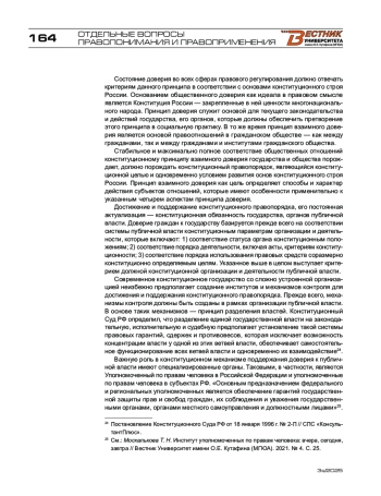 6. Комарова В. В. Конституционно-правовая доктрина «Доверие» в научной школе российского конституционализма // Вестник Университета имени О.Е. Кутафина (МГЮА). - 2022. - № 6. - С. 29-38.