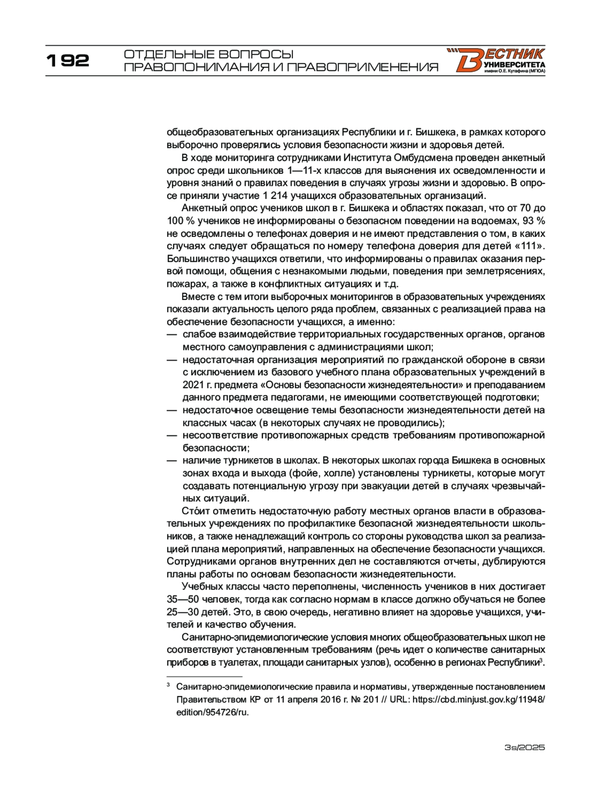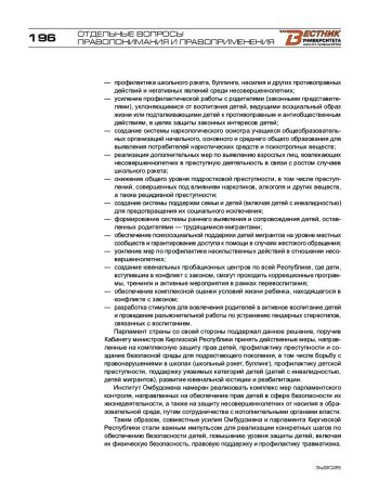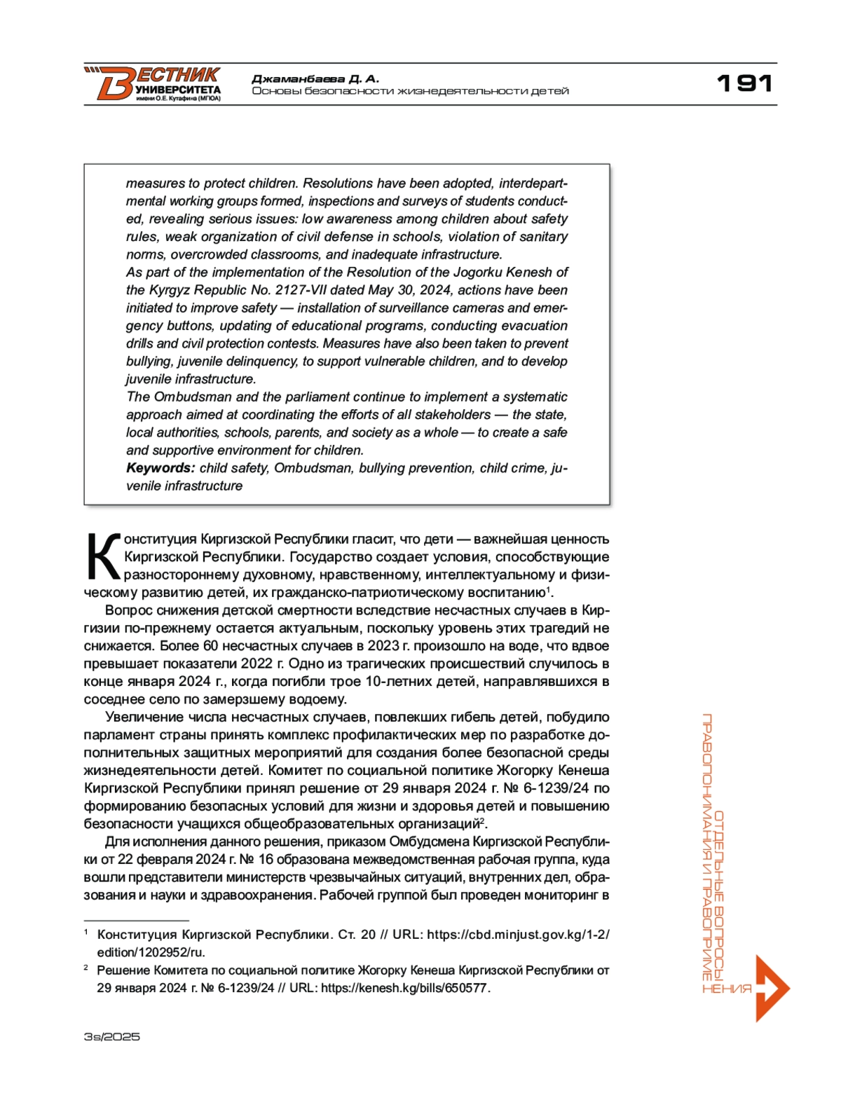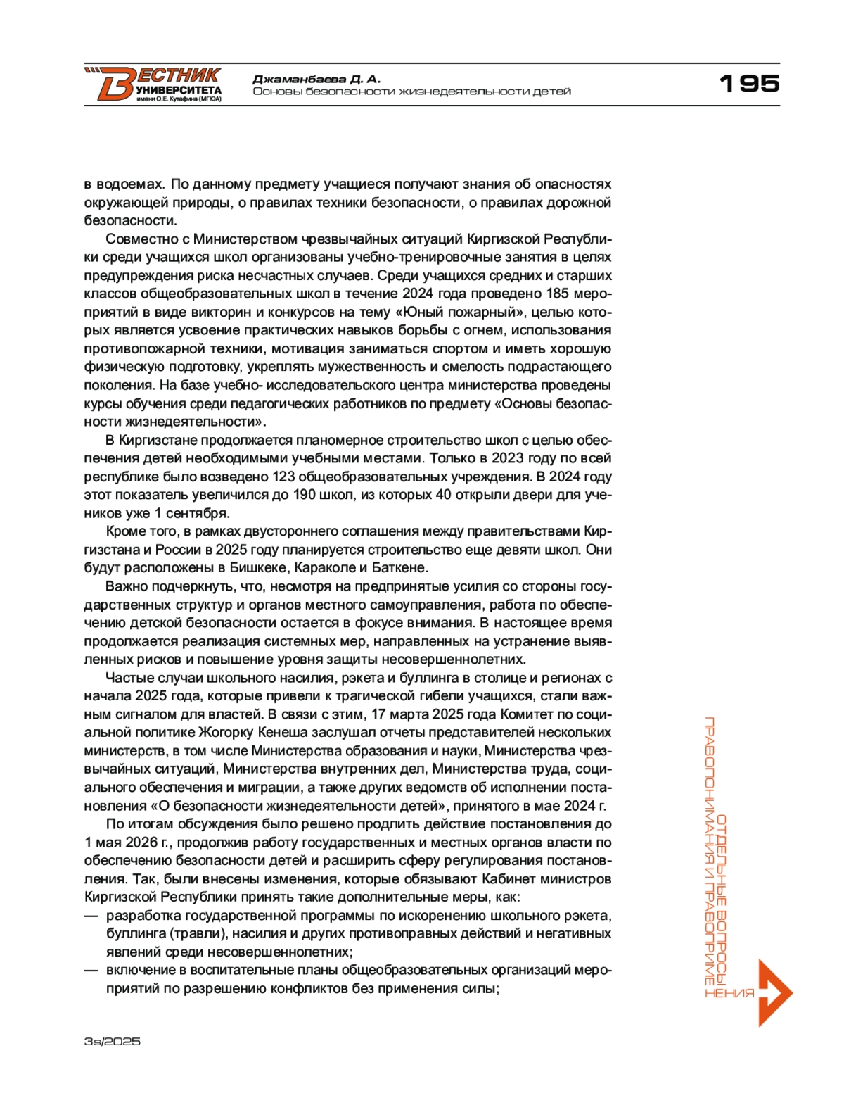 В связи с трагическими происшествиями, включая гибель детей на водоемах и случаи школьного насилия, парламент и органы власти усилили меры по защите детей. Были приняты постановления, образованы межведомственные рабочие группы, организованы проверки, мониторинги и опрос учащихся, выявившие серьезные проблемы: низкую осведомленность детей о правилах безопасности, слабую организацию гражданской обороны в школах, нарушение санитарных норм, перегруженность классов и недостатки в инфраструктуре. В рамках реализации постановления Жогорку Кенеша Киргизской Республики от 30 мая 2024 г. № 2127-VII начаты мероприятия по улучшению безопасности — установка камер и тревожных кнопок, обновление учебных программ, проведение эвакуационных учений и конкурсов по гражданской защите. Приняты меры по профилактике буллинга, детской преступности, поддержке уязвимых категорий детей и созданию ювенальной инфраструктуры.