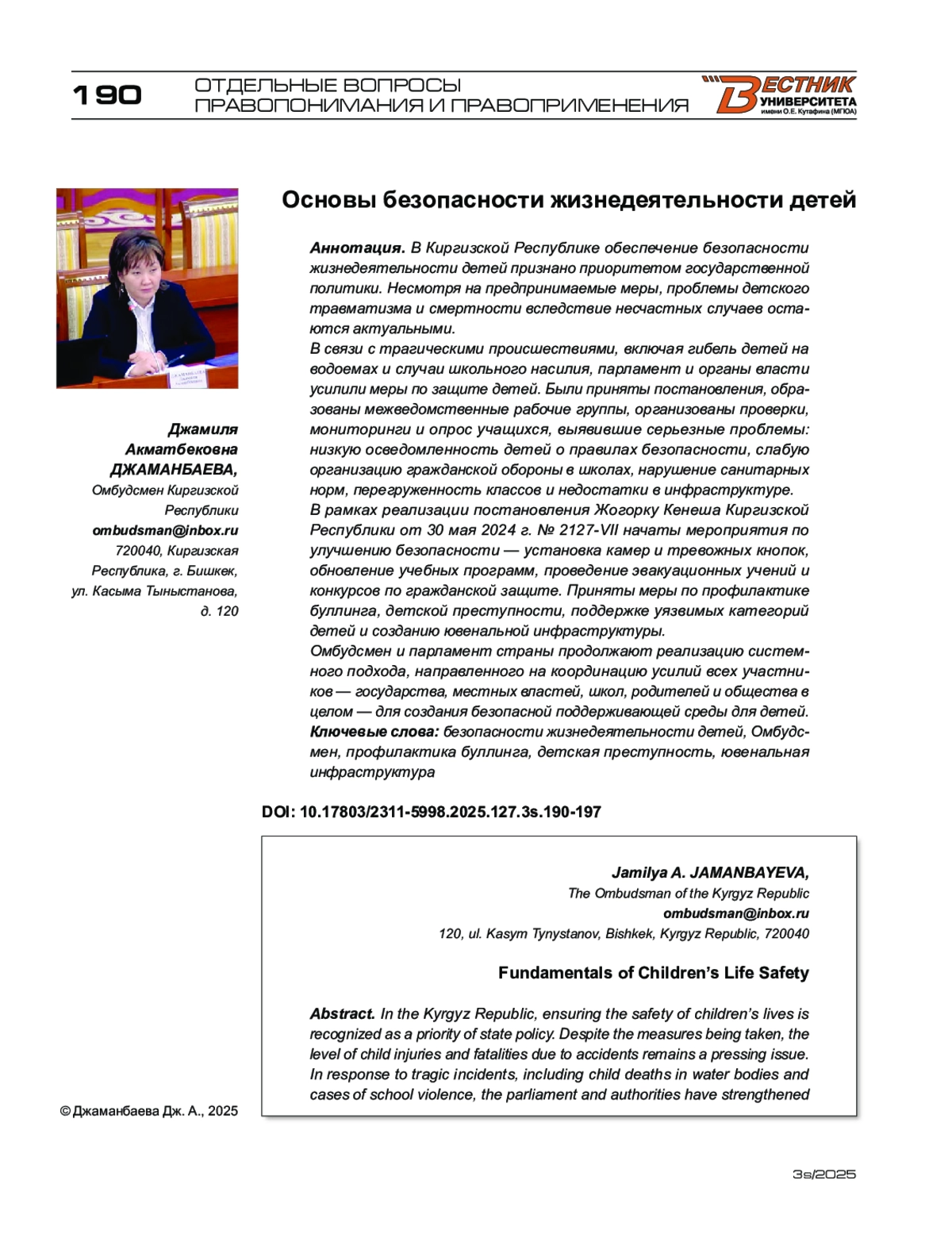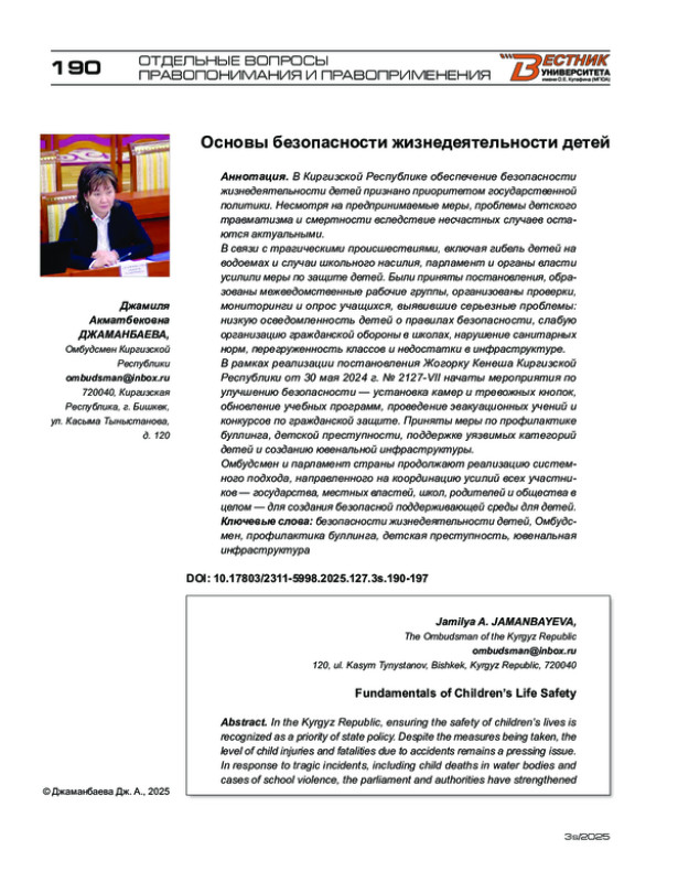 В Киргизской Республике обеспечение безопасности жизнедеятельности детей признано приоритетом государственной политики. Несмотря на предпринимаемые меры, проблемы детского травматизма и смертности вследствие несчастных случаев остаются актуальными.