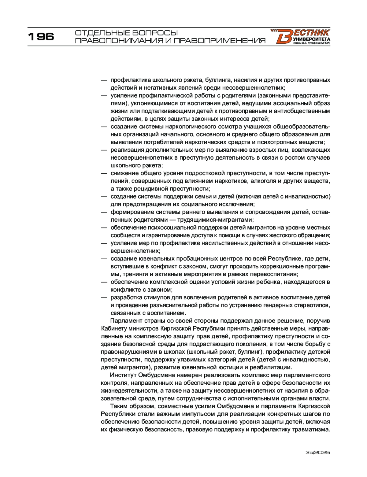 Омбудсмен и парламент страны продолжают реализацию системного подхода, направленного на координацию усилий всех участников — государства, местных властей, школ, родителей и общества в целом — для создания безопасной поддерживающей среды для детей.