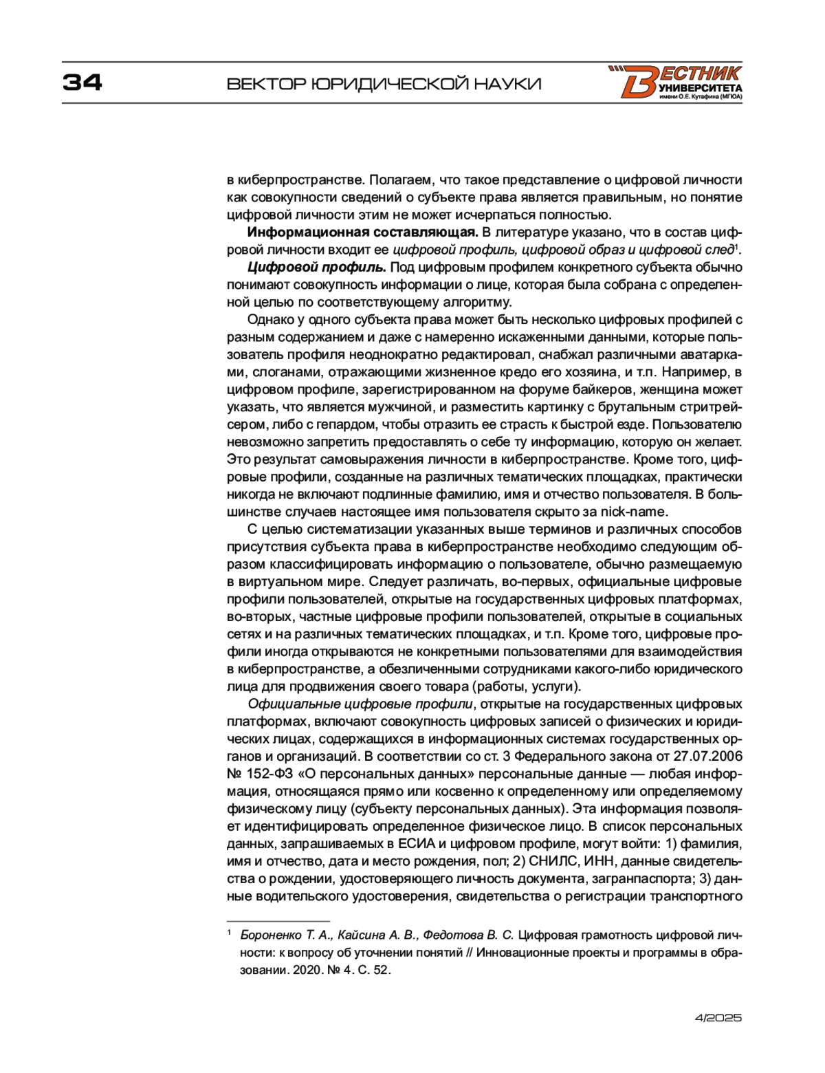 2. Бороненко Т. А., Кайсина А. В., Федотова В. С. Цифровая грамотность цифровой личности: к вопросу об уточнении понятий // Инновационные проекты и программы в образовании. - 2020. - № 4. - С. 48-55.