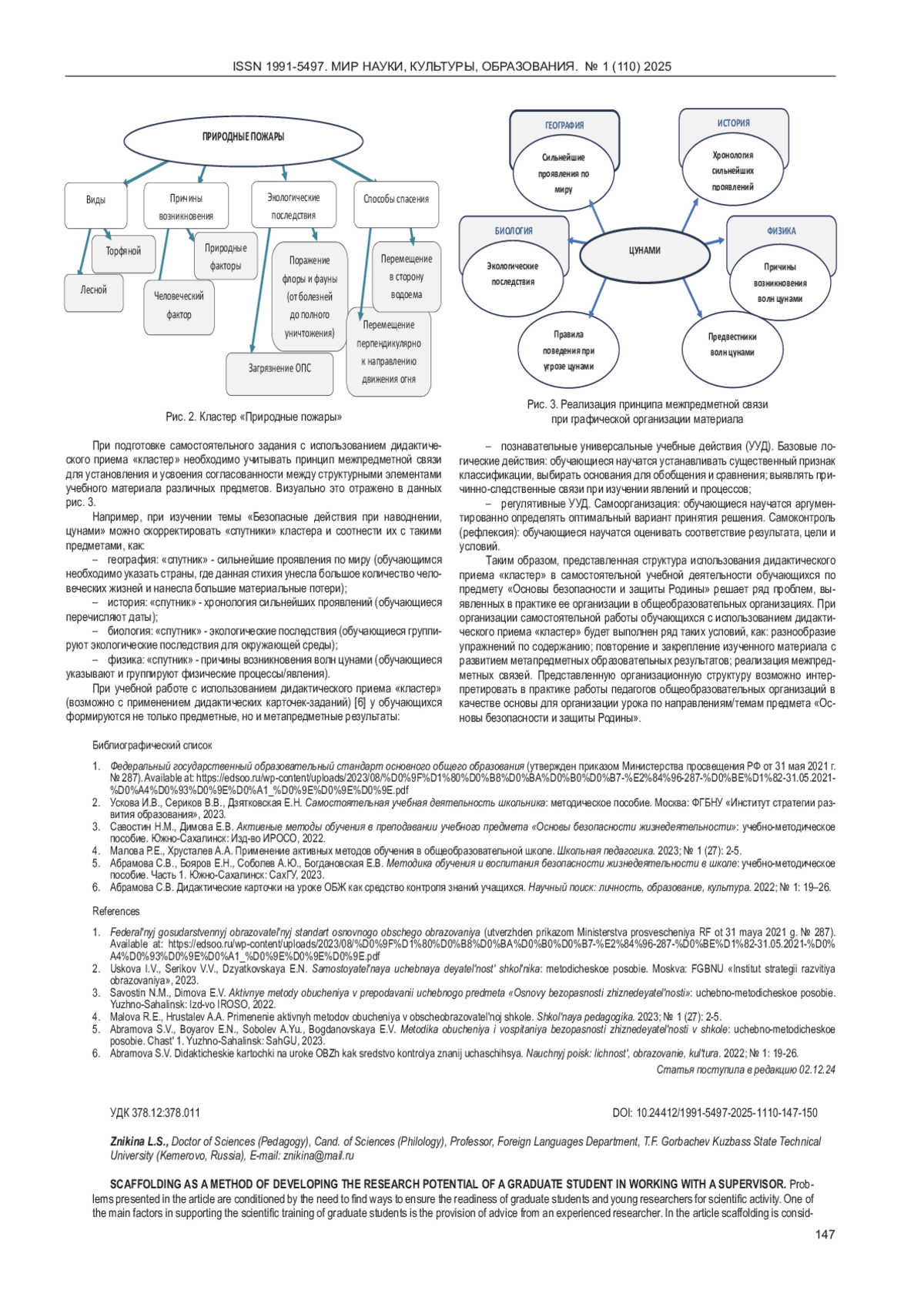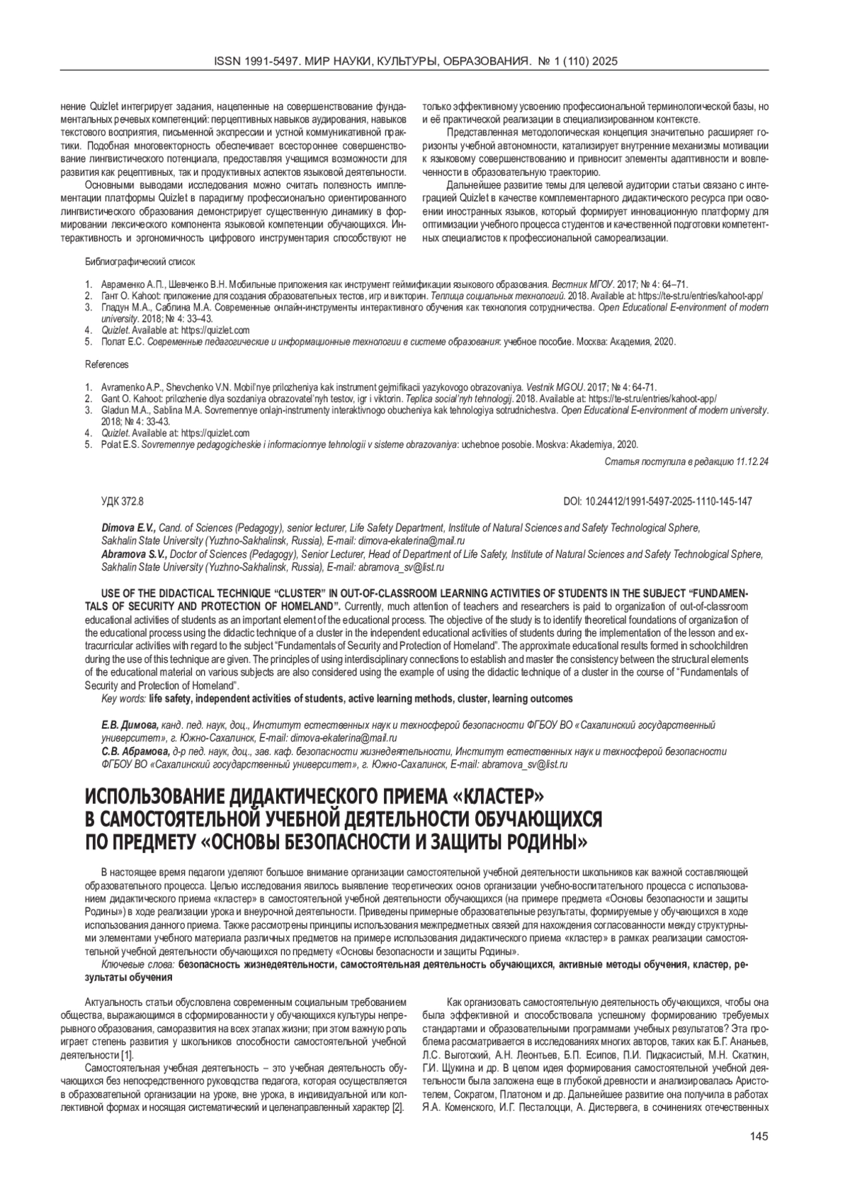 6. 	Абрамова С.В. Дидактические карточки на уроке ОБЖ как средство контроля знаний учащихся. Научный поиск: личность, образование, культура. 2022; № 1: 19-26. EDN: UHCWBW