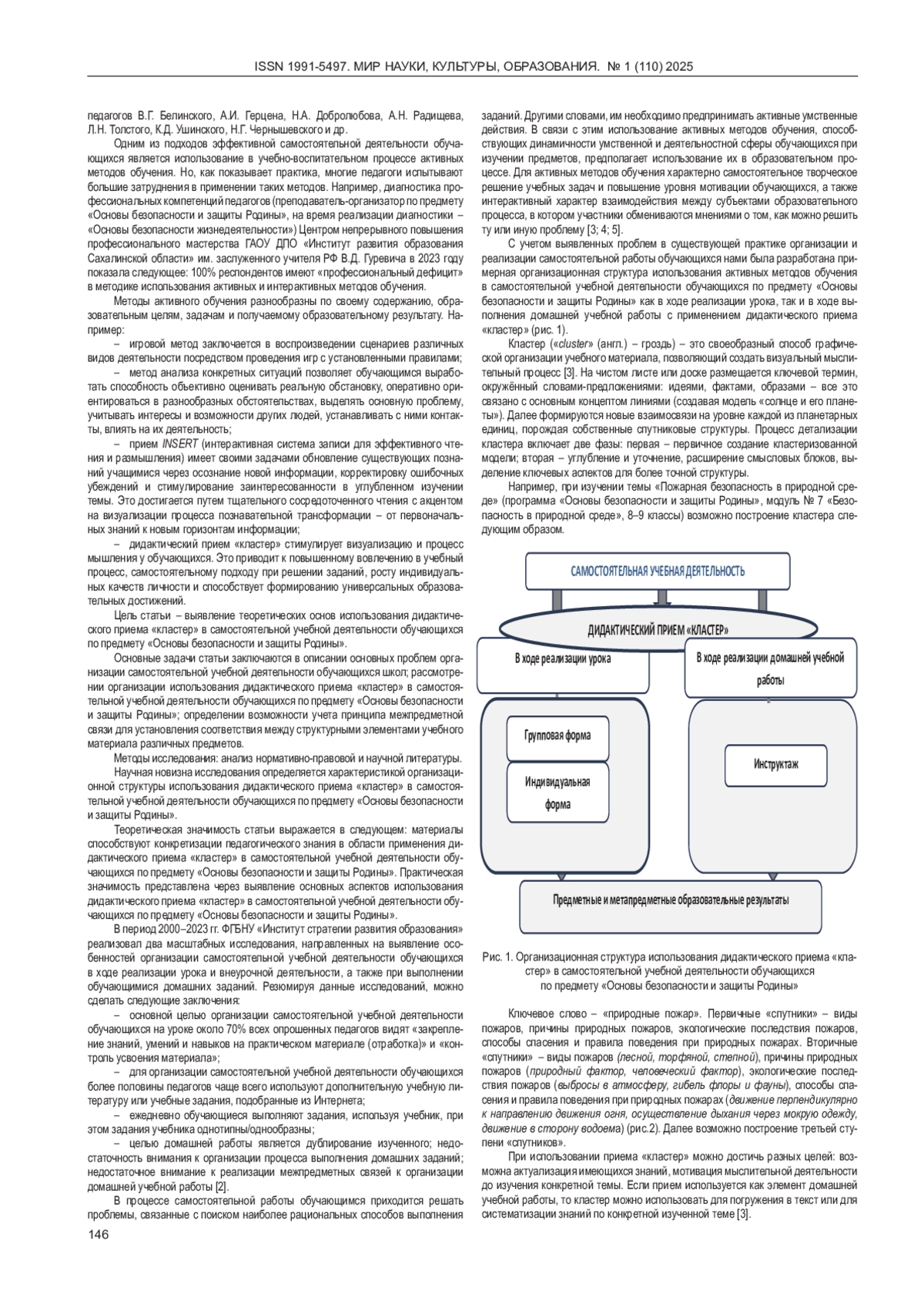 В настоящее время педагоги уделяют большое внимание организации самостоятельной учебной деятельности школьников как важной составляющей образовательного процесса. Целью исследования явилось выявление теоретических основ организации учебно-воспитательного процесса с использованием дидактического приема «кластер» в самостоятельной учебной деятельности обучающихся (на примере предмета «Основы безопасности и защиты Родины») в ходе реализации урока и внеурочной деятельности. Приведены примерные образовательные результаты, формируемые у обучающихся в ходе использования данного приема. Также рассмотрены принципы использования межпредметных связей для нахождения согласованности между структурными элементами учебного материала различных предметов на примере использования дидактического приема «кластер» в рамках реализации самостоятельной учебной деятельности обучающихся по предмету «Основы безопасности и защиты Родины».
