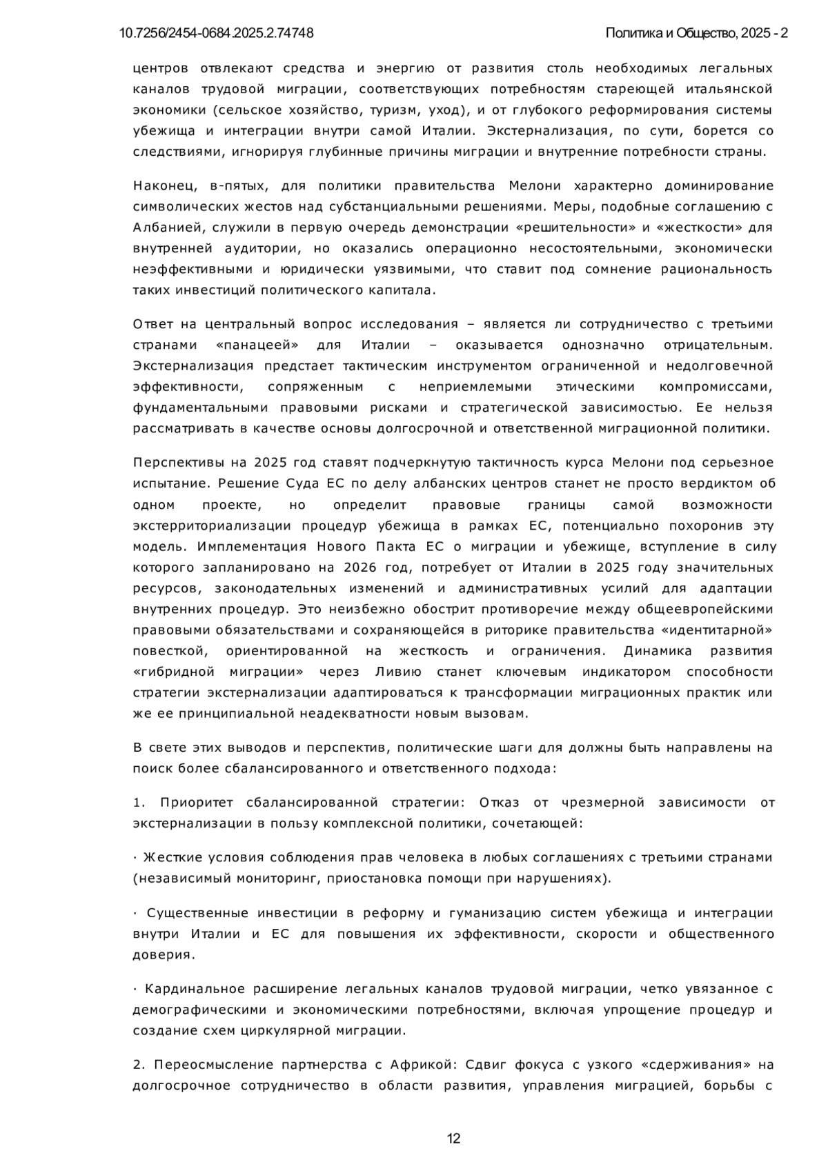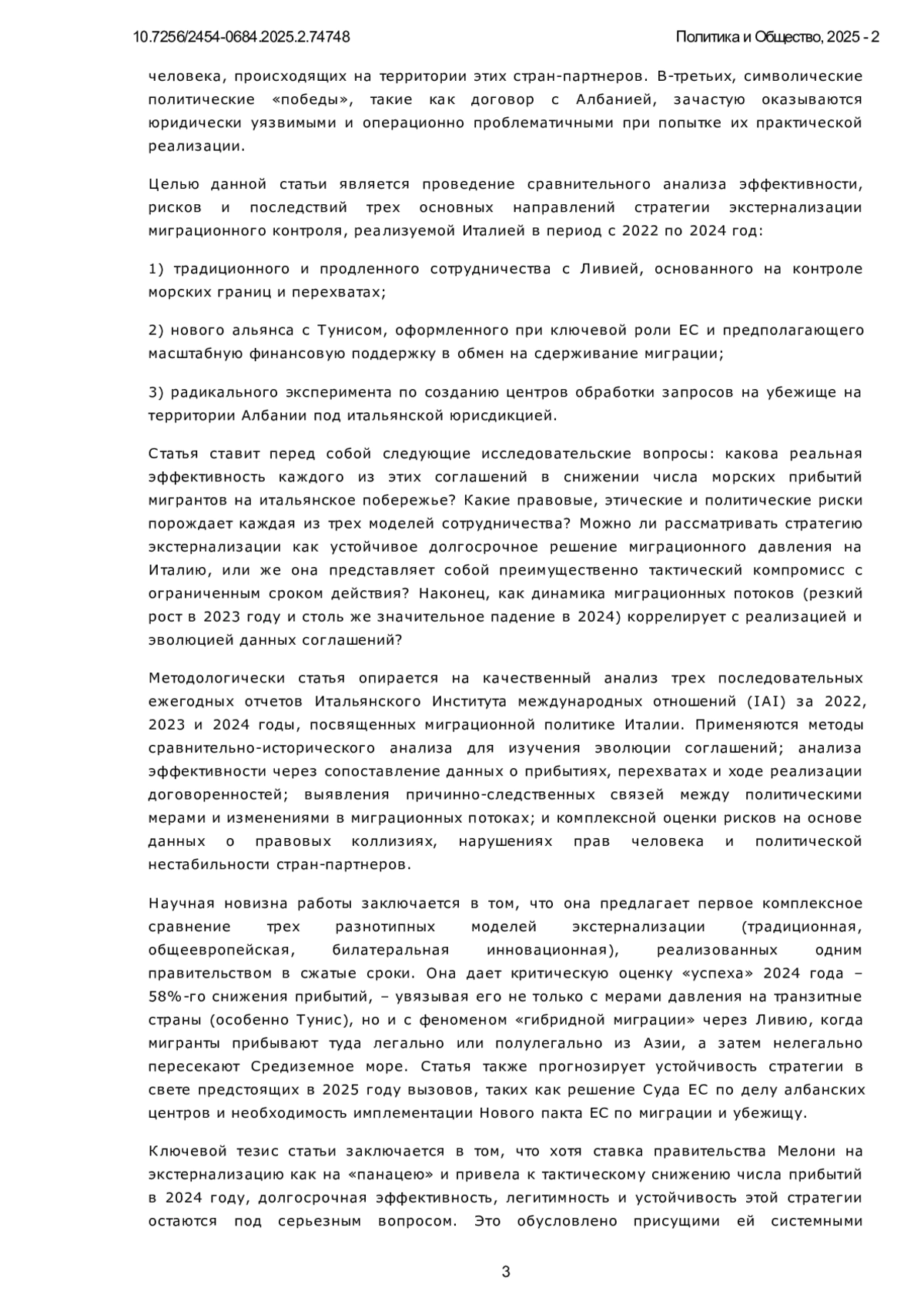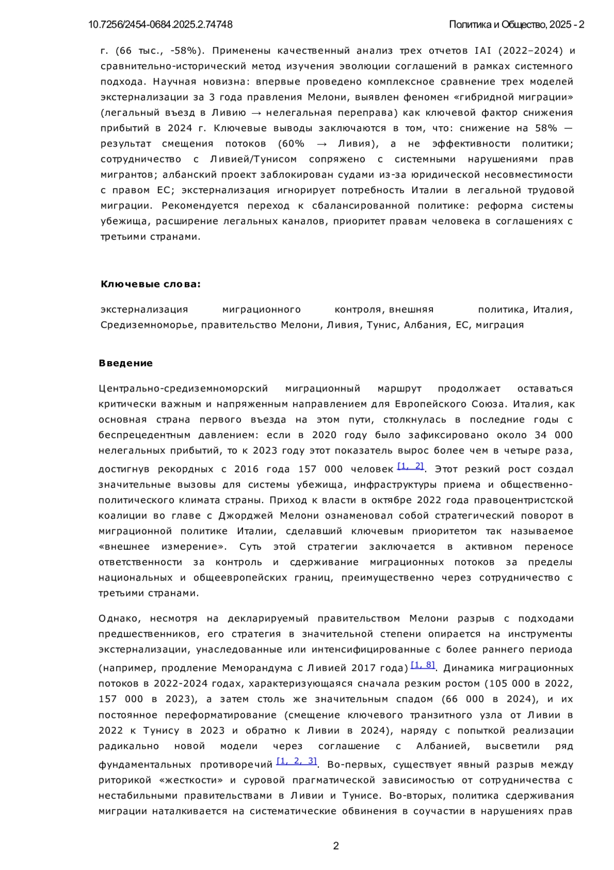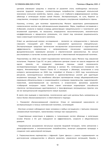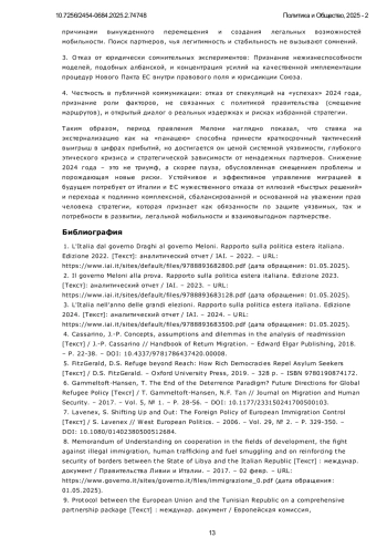 Миграционный кризис остается наиболее острым вопросом средиземноморского вектора внешней политики Италии. Статья исследует стратегию экстернализации миграционного контроля Италии в период 2022-2024 гг., реализуемую правительством Джорджии Мелони через сотрудничество с третьими странами. Фокус анализа сосредоточен на трех ключевых направлениях: традиционное партнерство с Ливией (продление Меморандума 2017 г.), новая модель сдерживания с Тунисом (соглашение ЕС-Тунис 2023 г.), радикальный эксперимент с Албанией (экстерриториальные центры обработки убежищ). Цель работы заключается в оценке эффективности, правовых рисков и этических последствий данных механизмов в контексте рекордного роста прибытий в 2023 г. (157 тыс.) и их резкого снижения в 2024 г. (66 тыс., -58%). Применены качественный анализ трех отчетов IAI (2022-2024) и сравнительно-исторический метод изучения эволюции соглашений в рамках системного подхода. Научная новизна: впервые проведено комплексное сравнение трех моделей экстернализации за 3 года правления Мелони, выявлен феномен «гибридной миграции» (легальный въезд в Ливию → нелегальная переправа) как ключевой фактор снижения прибытий в 2024 г. Ключевые выводы заключаются в том, что: снижение на 58% - результат смещения потоков (60% → Ливия), а не эффективности политики; сотрудничество с Ливией/Тунисом сопряжено с системными нарушениями прав мигрантов; албанский проект заблокирован судами из-за юридической несовместимости с правом ЕС; экстернализация игнорирует потребность Италии в легальной трудовой миграции. Рекомендуется переход к сбалансированной политике: реформа системы убежища, расширение легальных каналов, приоритет правам человека в соглашениях с третьими странами.