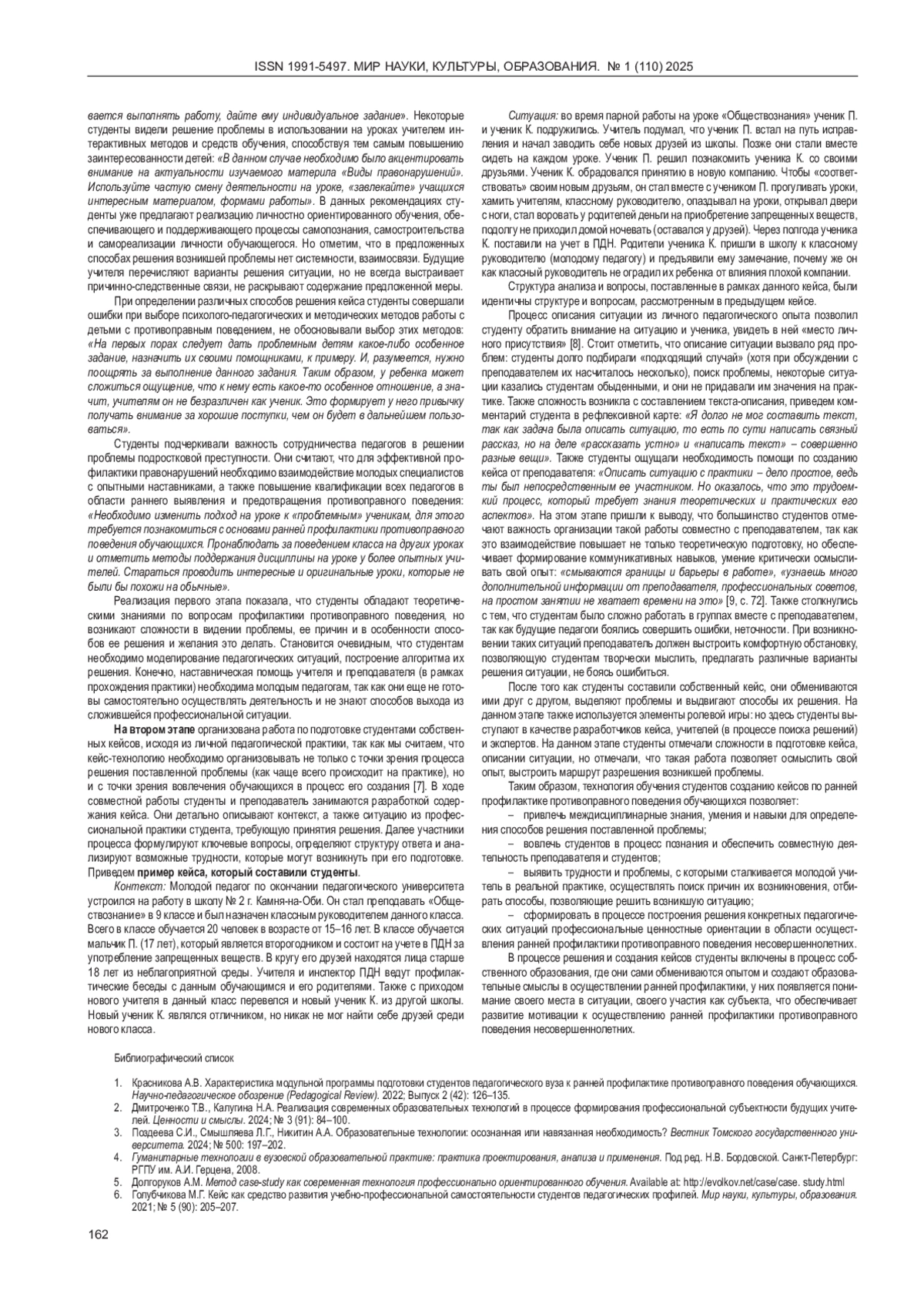 9. Красникова А.В. Кейс-технология в развитии субъектной позиции будущего учителя в осуществлении ранней профилактики противоправного поведения обучающихся. Материалы Международной научно-практической конференции. Томск: ТГПУ, 2024: 68-73. EDN: FHKGFS
