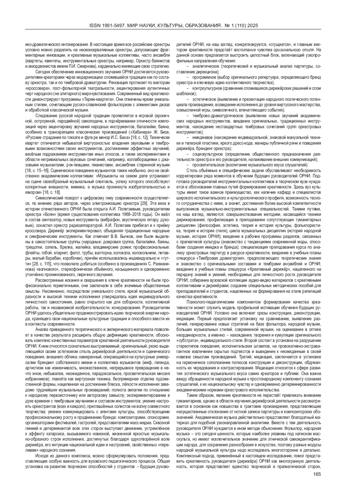 Статья: КРЕАТИВНОСТЬ РУКОВОДИТЕЛЯ ОРКЕСТРА НАРОДНЫХ ИНСТРУМЕНТОВ И ПУТИ ЕЁ ФОРМИРОВАНИЯ В ВУЗЕ КУЛЬТУРЫ (2025)