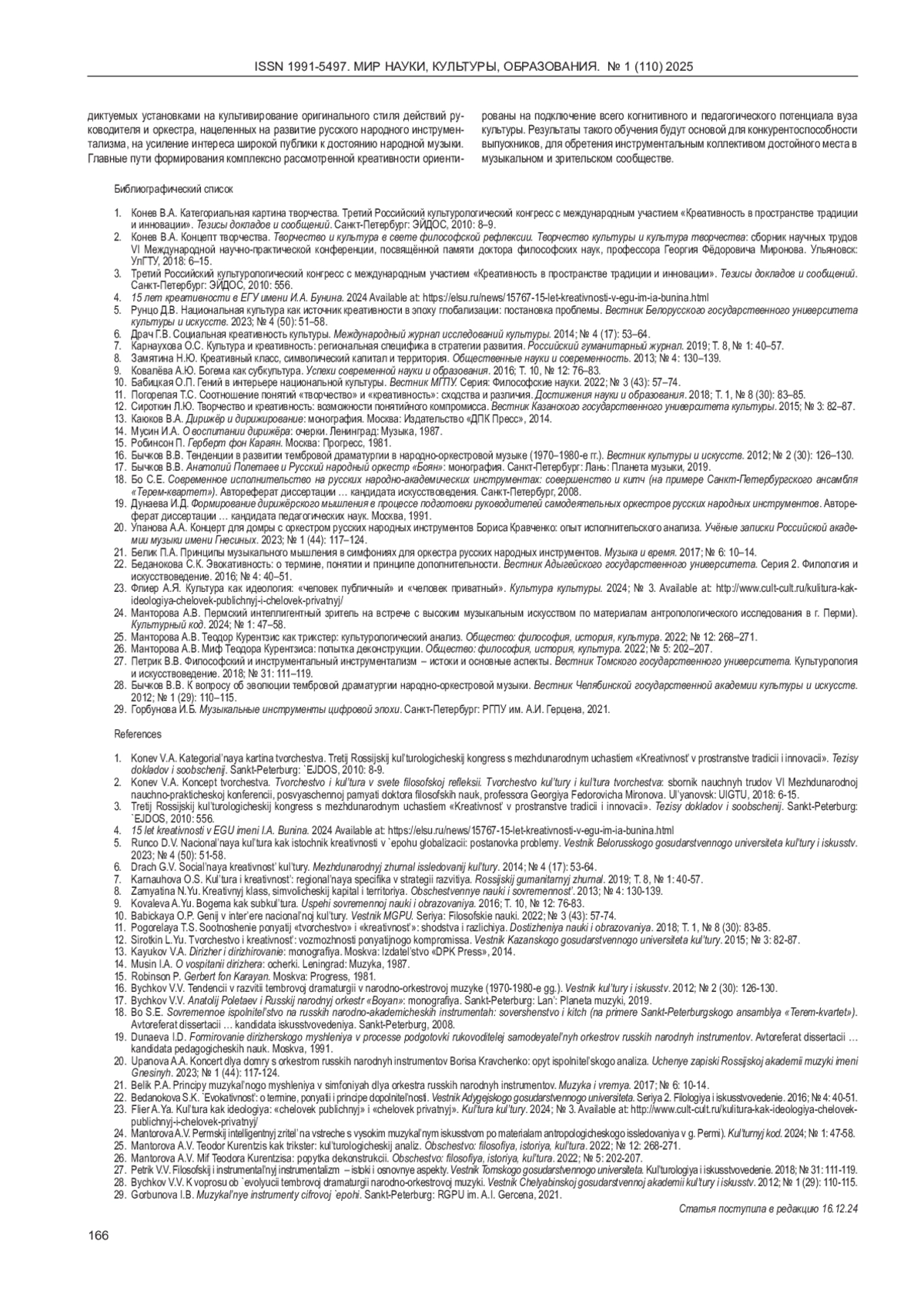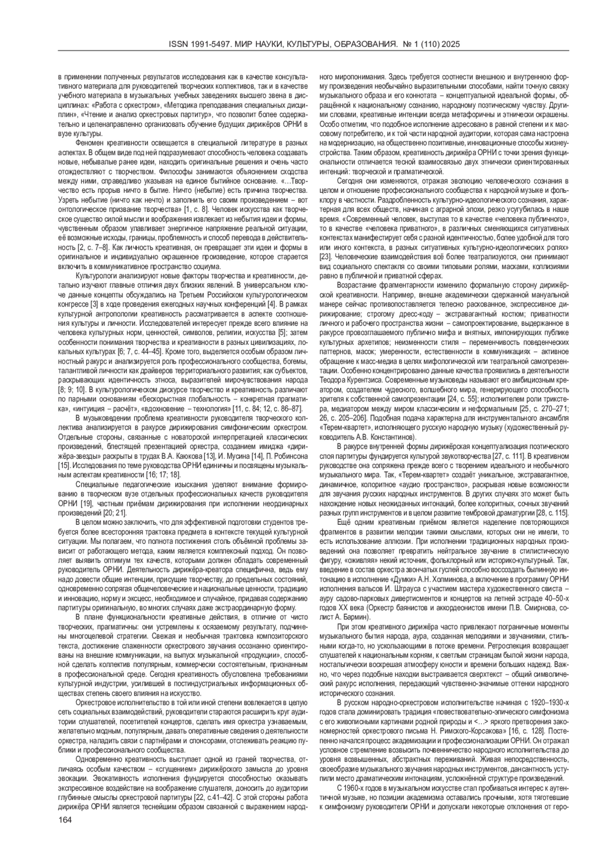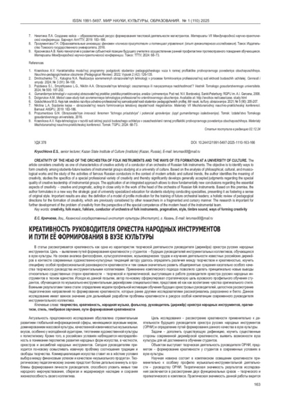 КРЮЧКОВА Е. С. КРЕАТИВНОСТЬ РУКОВОДИТЕЛЯ ОРКЕСТРА НАРОДНЫХ ИНСТРУМЕНТОВ И ПУТИ ЕЁ ФОРМИРОВАНИЯ В ВУЗЕ КУЛЬТУРЫ // МИР НАУКИ, КУЛЬТУРЫ, ОБРАЗОВАНИЯ. 2025. № 1 (110)