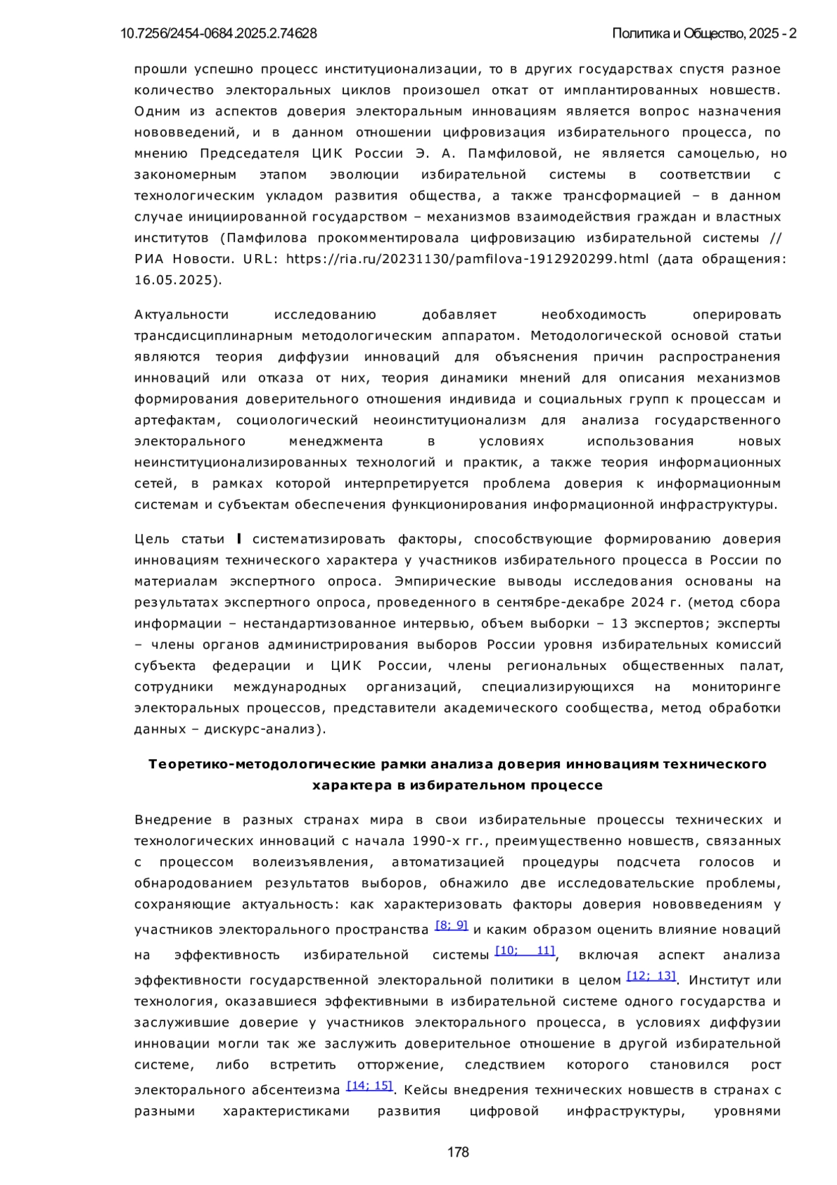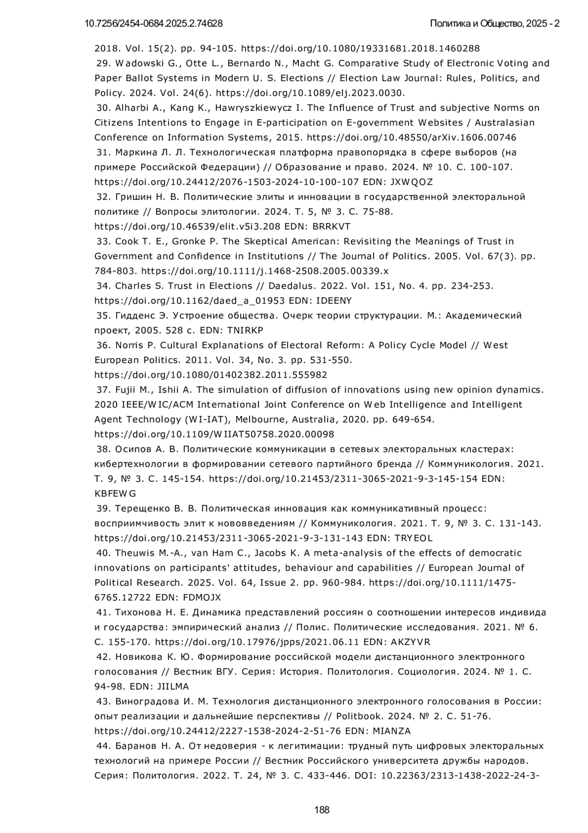 1. Иванов Д. Ю. Политическая активность и доверие избирателей в условиях цифровизации избирательного процесса // Политическая экспертиза: ПОЛИТЭКС. 2024. Т. 20, № 1. С. 45-63. DOI: 10.21638/spbu23.2024.104