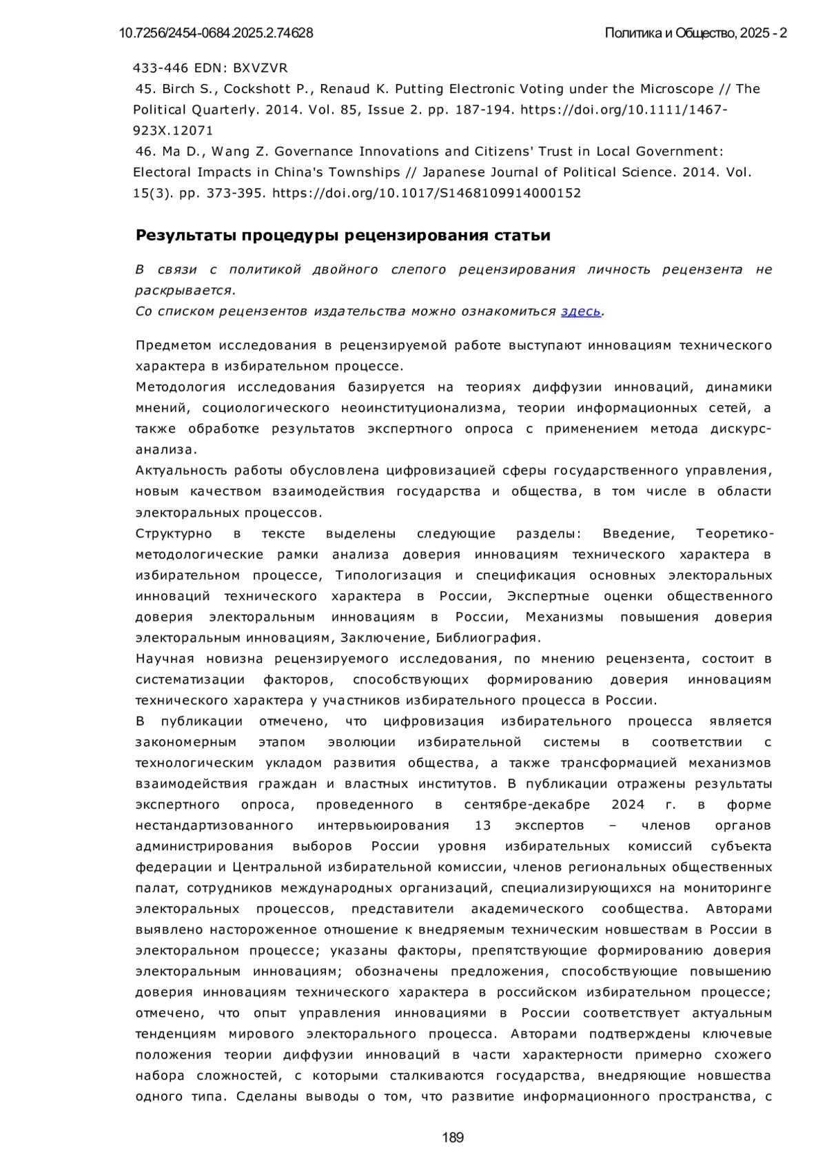 46. Ma D., Wang Z. Governance Innovations and Citizens’ Trust in Local Government: Electoral Impacts in China’s Townships // Japanese Journal of Political Science. 2014. Vol. 15(3). pp. 373-395. DOI: 10.1017/S1468109914000152
