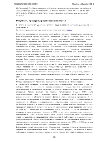 22. 	Тимшина Е.Л. “Мы возвращаем…”. Вопросы пенсионного обеспечения на выборах в Государственную Думу РФ VIII созыва. // Право и политика. 2022. № 3. С. 23-35. URL: https://nbpublish.com/library_read_article.php?id=36817.