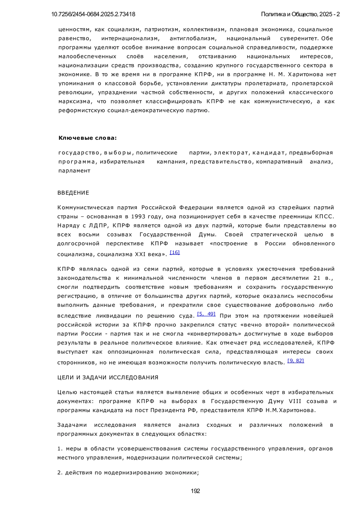 В статье осуществлён сравнительный анализ предвыборной программы Коммунистической партии Российской Федерации на выборах в Государственную Думу VIII созыва 2021 г. и предвыборной программы кандидата на пост Президента Российской Федерации, представителя КПРФ Н. М. Харитонова на выборах 2024 г. Методологической основой исследования являются компаративный анализ, исторический метод, ивент-анализ, кейс-метод, количественный контент-анализ. Анализ политических программ осуществлён по следующим положениям: реформирование системы государственного управления; действия по модернизации российской экономики; шаги по усовершенствованию социальной политики в стране; политика в области принятия нормативно-правовых актов; комплекс мер в области мировой политики и международных отношений. Как показал анализ, как в предвыборной программе Н. М. Харитонова, так и в программе КПРФ значительное место уделено таким ценностям, как социализм, патриотизм, коллективизм, плановая экономика, социальное равенство, интернационализм, антиглобализм, национальный суверенитет. Обе программы уделяют особое внимание вопросам социальной справедливости, поддержке малообеспеченных слоёв населения, отстаиванию национальных интересов, национализации средств производства, созданию крупного государственного сектора в экономике. В то же время ни в программе КПРФ, ни в программе Н. М. Харитонова нет упоминания о классовой борьбе, установлении диктатуры пролетариата, пролетарской революции, упразднении частной собственности, и других положений классического марксизма, что позволяет классифицировать КПРФ не как коммунистическую, а как реформистскую социал-демократическую партию.