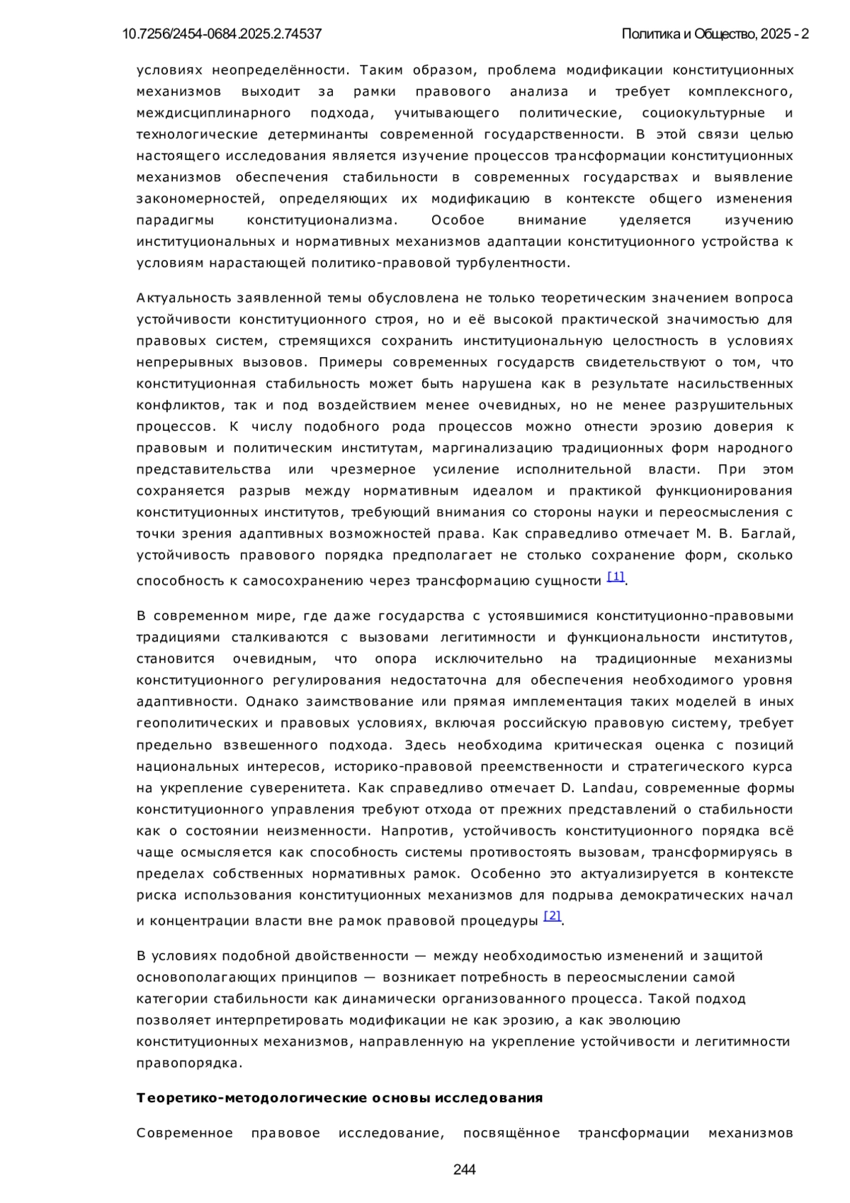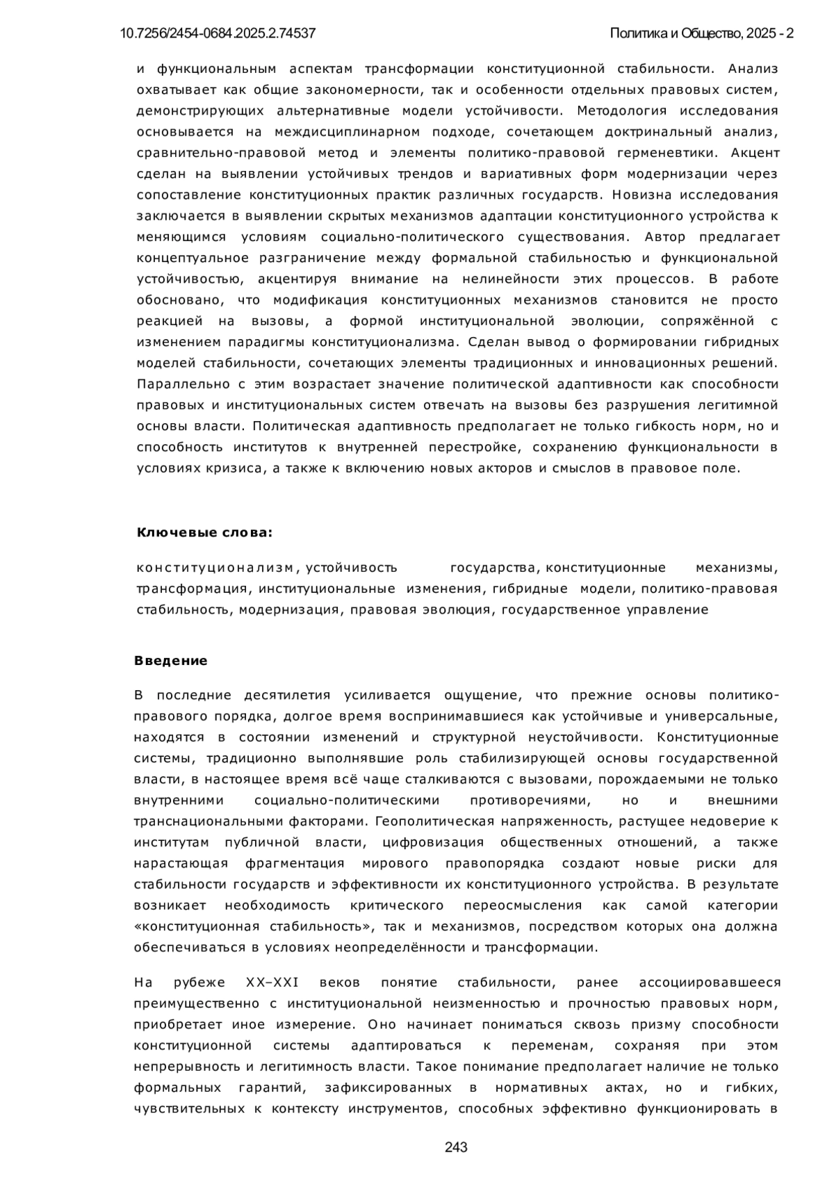 В последние десятилетия усиливается ощущение, что прежние основы политикоправового порядка, долгое время воспринимавшиеся как устойчивые и универсальные, находятся в состоянии изменений и структурной неустойчивости. Конституционные системы, традиционно выполнявшие роль стабилизирующей основы государственной власти, в настоящее время всё чаще сталкиваются с вызовами, порождаемыми не только внутренними социально-политическими противоречиями, но и внешними транснациональными факторами. Геополитическая напряженность, растущее недоверие к институтам публичной власти, цифровизация общественных отношений, а также нарастающая фрагментация мирового правопорядка создают новые риски для стабильности государств и эффективности их конституционного устройства. В результате возникает необходимость критического переосмысления как самой категории «конституционная стабильность», так и механизмов, посредством которых она должна обеспечиваться в условиях неопределённости и трансформации.